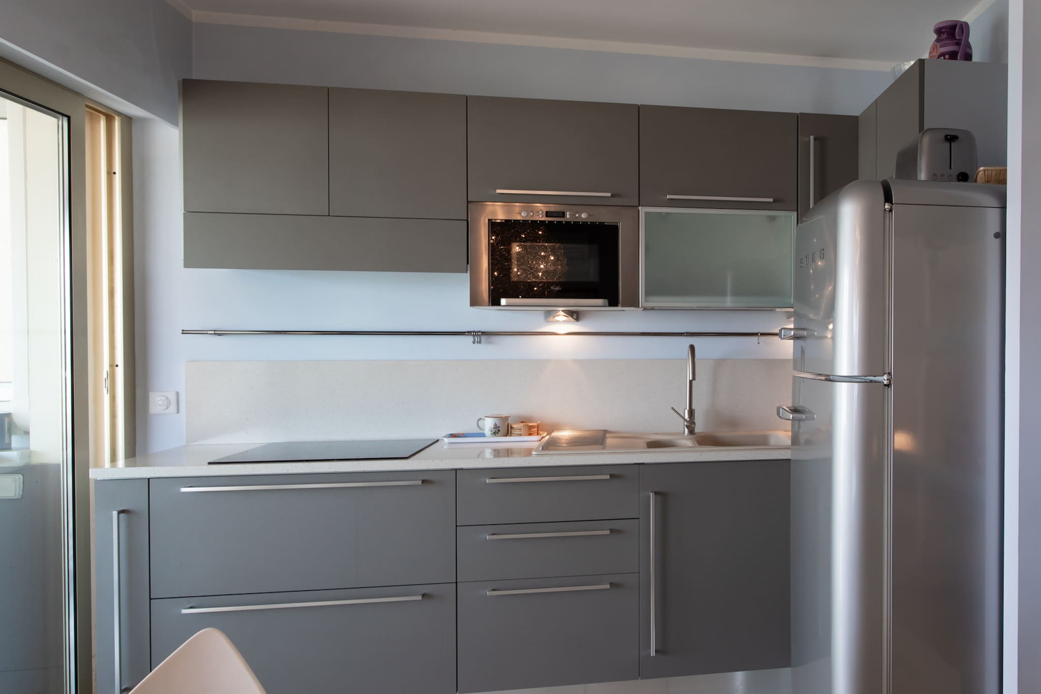 - a fully-equipped kitchen opening onto the living room, including fridge and freezer, hob, microwave, toaster, electric kettle, Nespresso coffee machine, cupboards and kitchen accessories