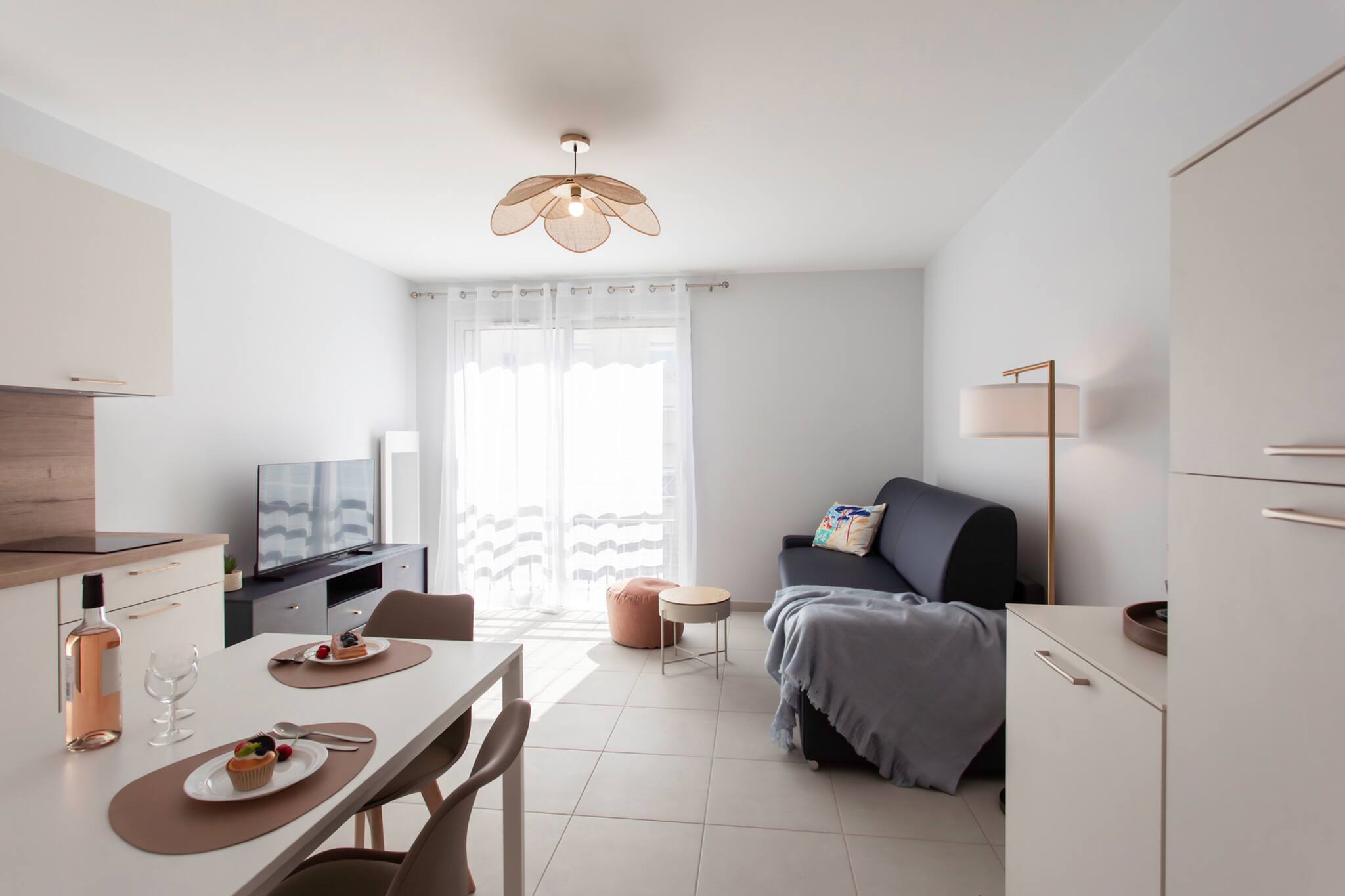 Just 5 minutes from the beaches of Juan les Pins and shops, you will be able to enjoy its modern and elegant decor and all the comforts you'll need: WIFI, fully-equipped kitchen opening onto the living room, TV, sofa bed, large shower room with washing machine and tumble dryer.