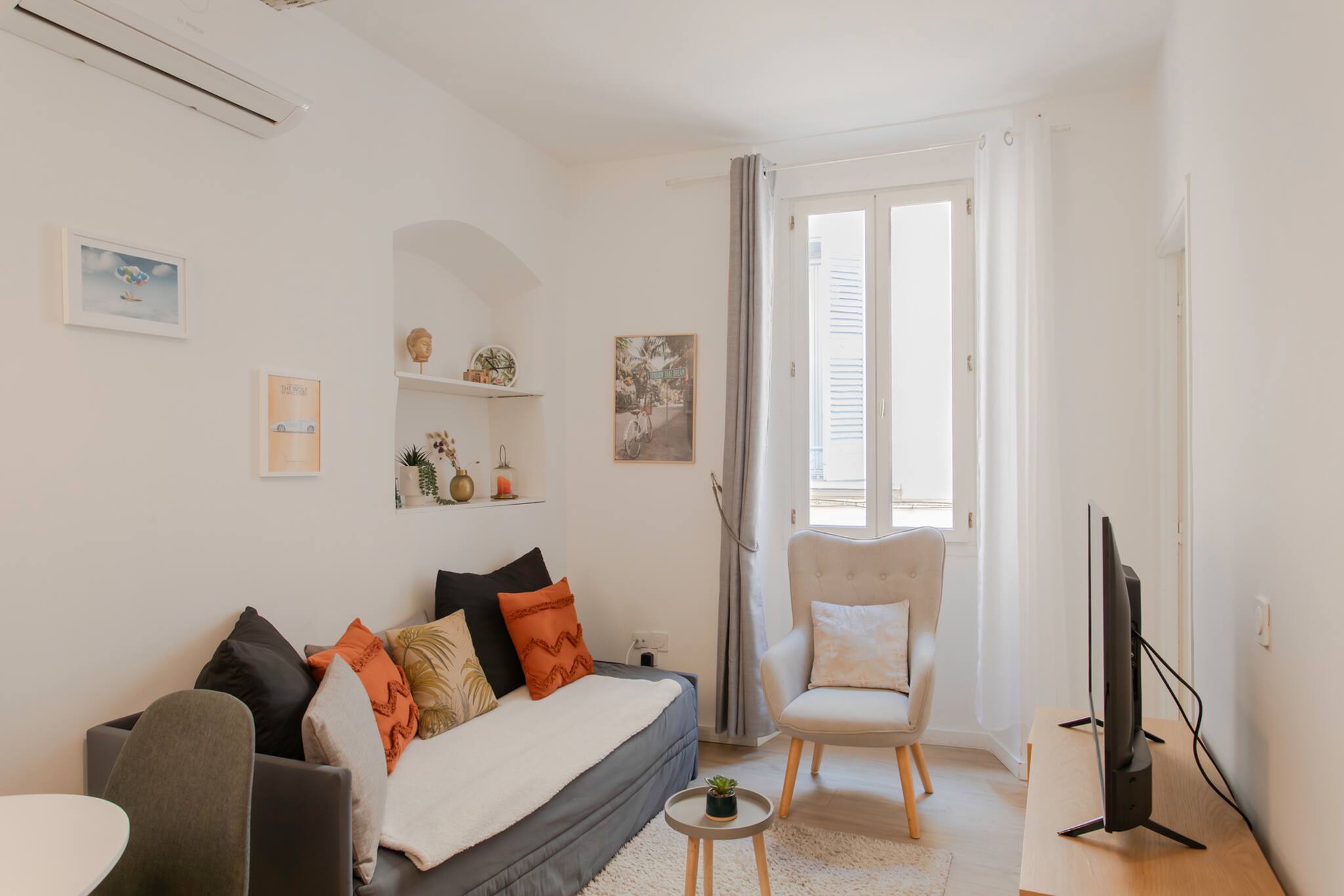 . A carefully decorated lounge area equipped with reversible air conditioning, a sofa, a TV and its console,