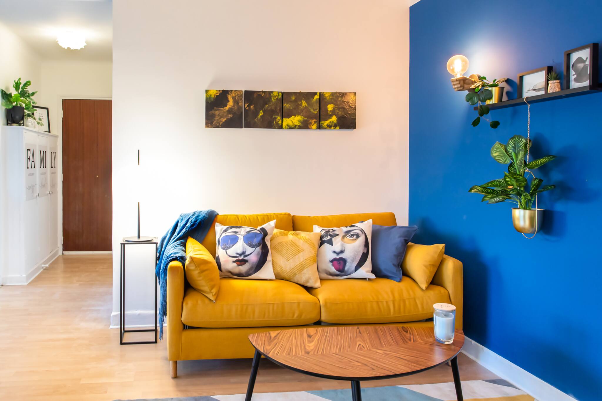 . Living room equipped with sofa, coffee table, TV, reversible air conditioning