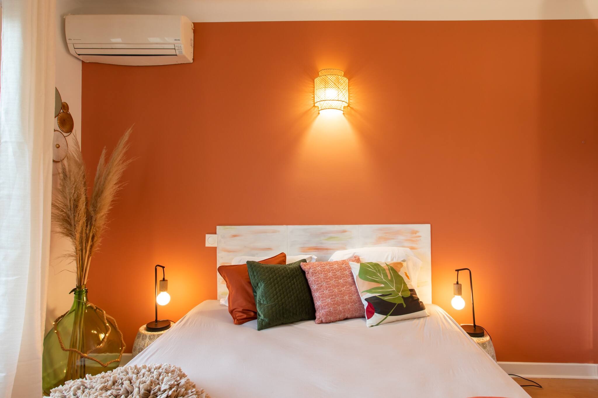 . A bedroom with double bed 160, reversible air conditioning, TV and TV cabinet, bedside table, bedside lamps, storage cupboards, double glazing