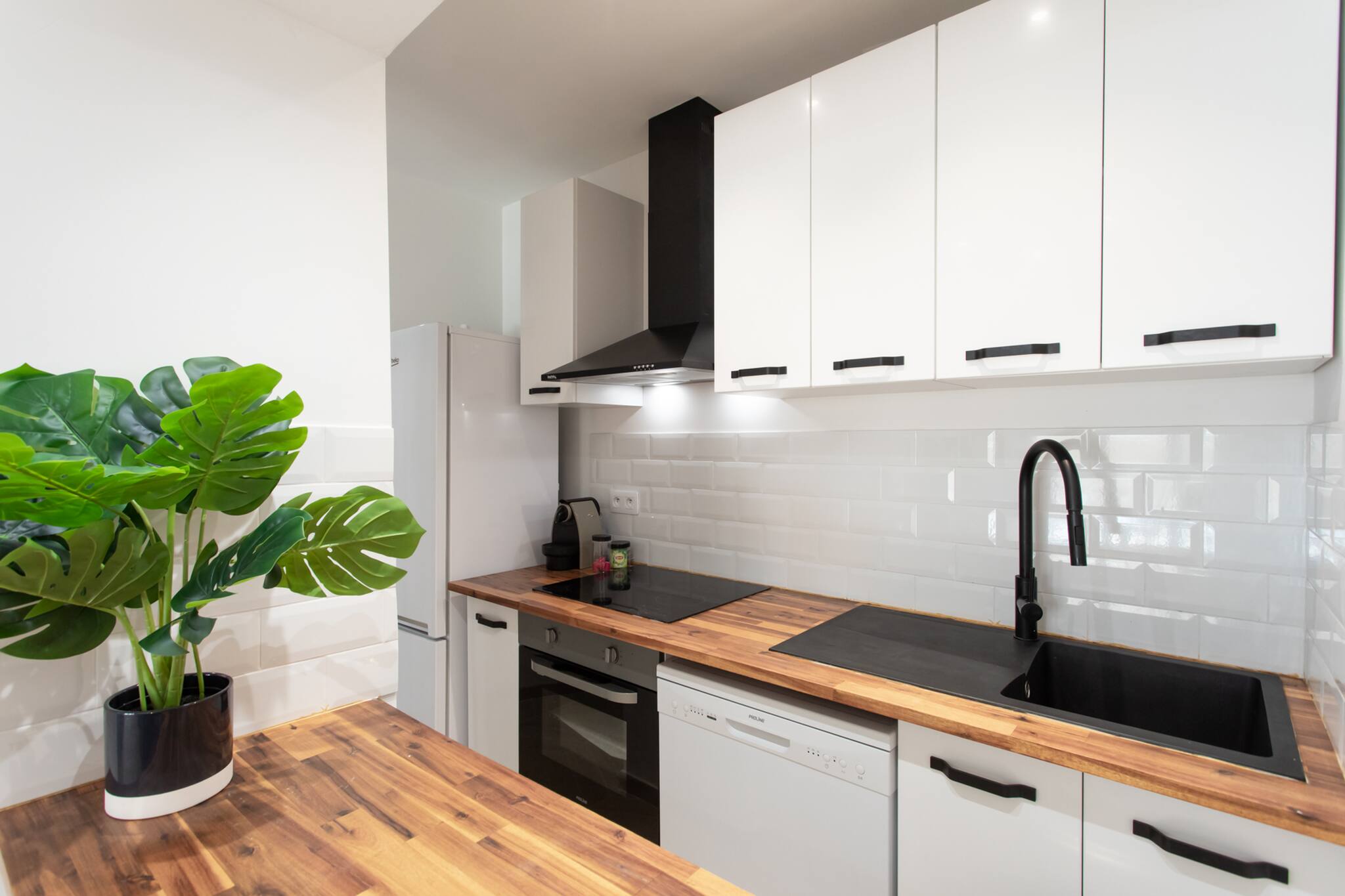. An equipped kitchen: refrigerator, freezer compartment, microwave, electric hob, coffee machine, kettle, toaster and a kit with the necessary for cooking