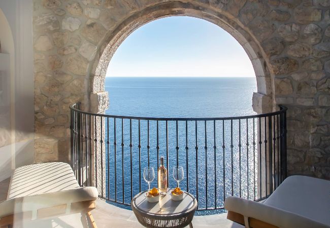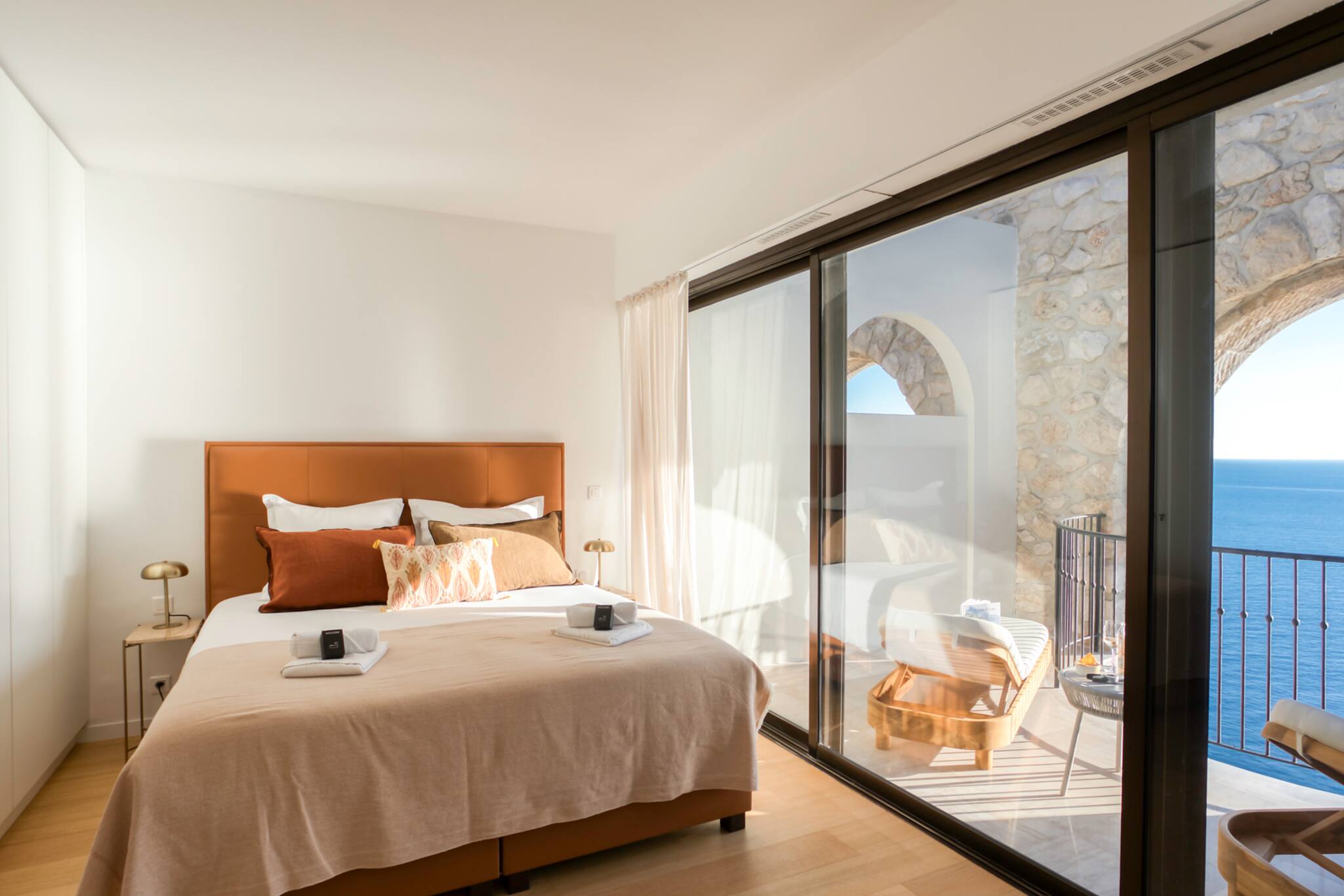 . The terrace of this bedroom is furnished with two loungers and a coffee table and offers one of the most exclusive sea views in the city