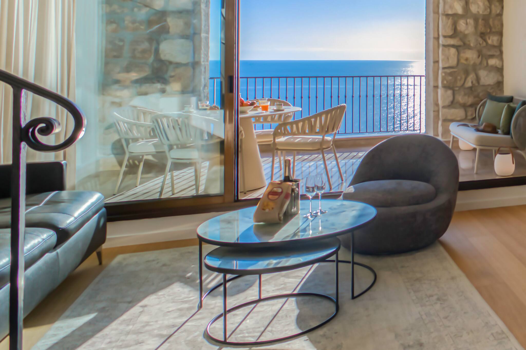 . Directly opposite, you will find a beautiful living-dining area with a direct sea view: a two-seater sofa, coffee tables, wall-mounted TV with its unit, armchair, reception benches, round ceramic table with four chairs, double-glazed bay windows with a sea view and terrace.
