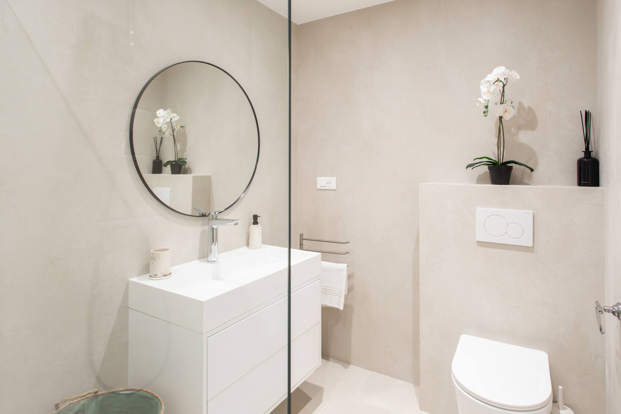 Bathroom with shower, sink, hairdryer, towel warmer, and WC