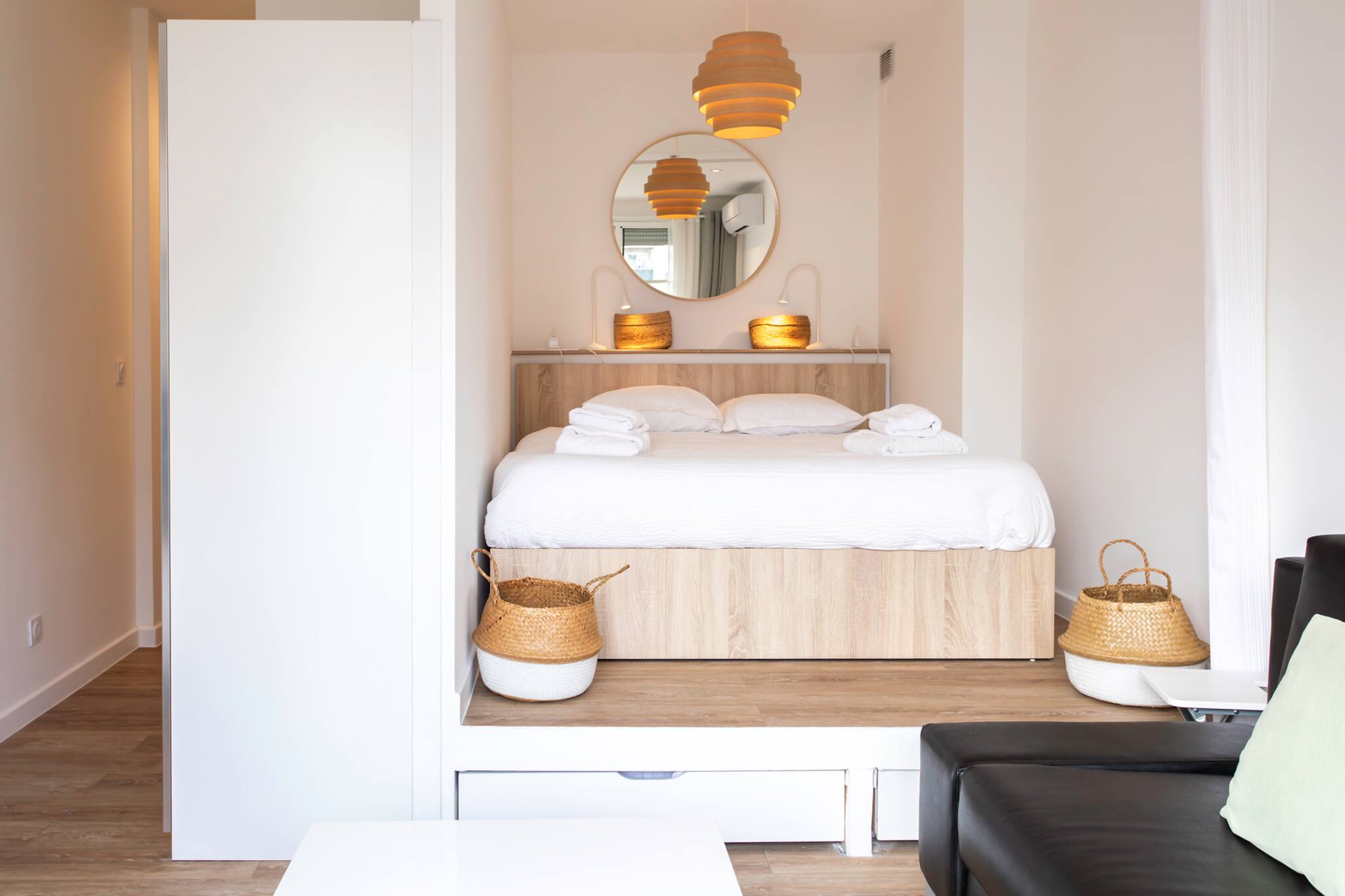 . A bedroom area on a platform equipped with a 160cm double bed, bedside table, 2 bedside lamps, pocket organizer.