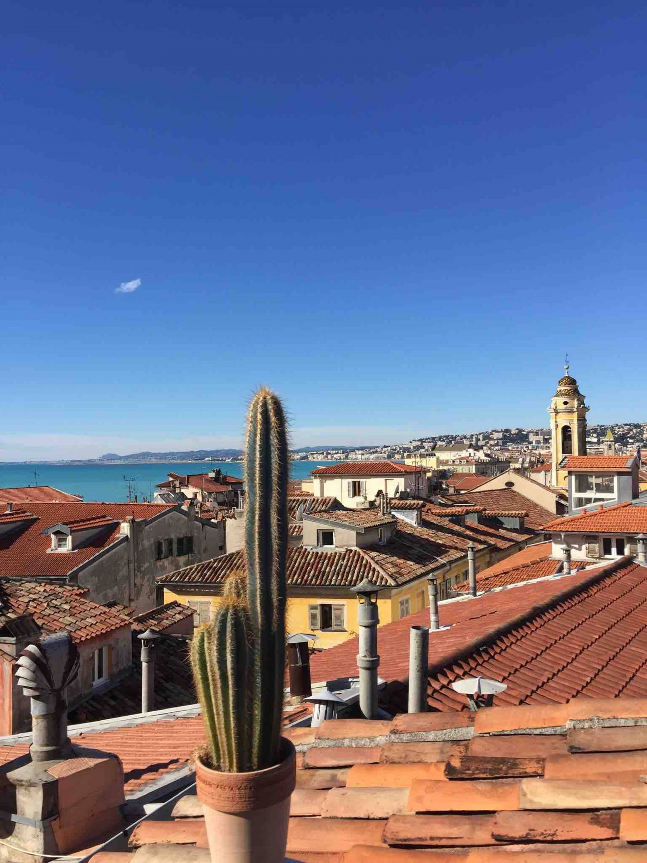 The bright air-conditioned 2-room attic of 45m² with a contemporary and highly-cared design has all the comforts to make your stay in Nice pleasant. Located on the 6th and last floor without elevator of a typical Nice building, it offers a panoramic terrace overlooking the old town, the sea and the hills. Shops, restaurants and bars are nearby. A romantic getaway or with friends is ideal!