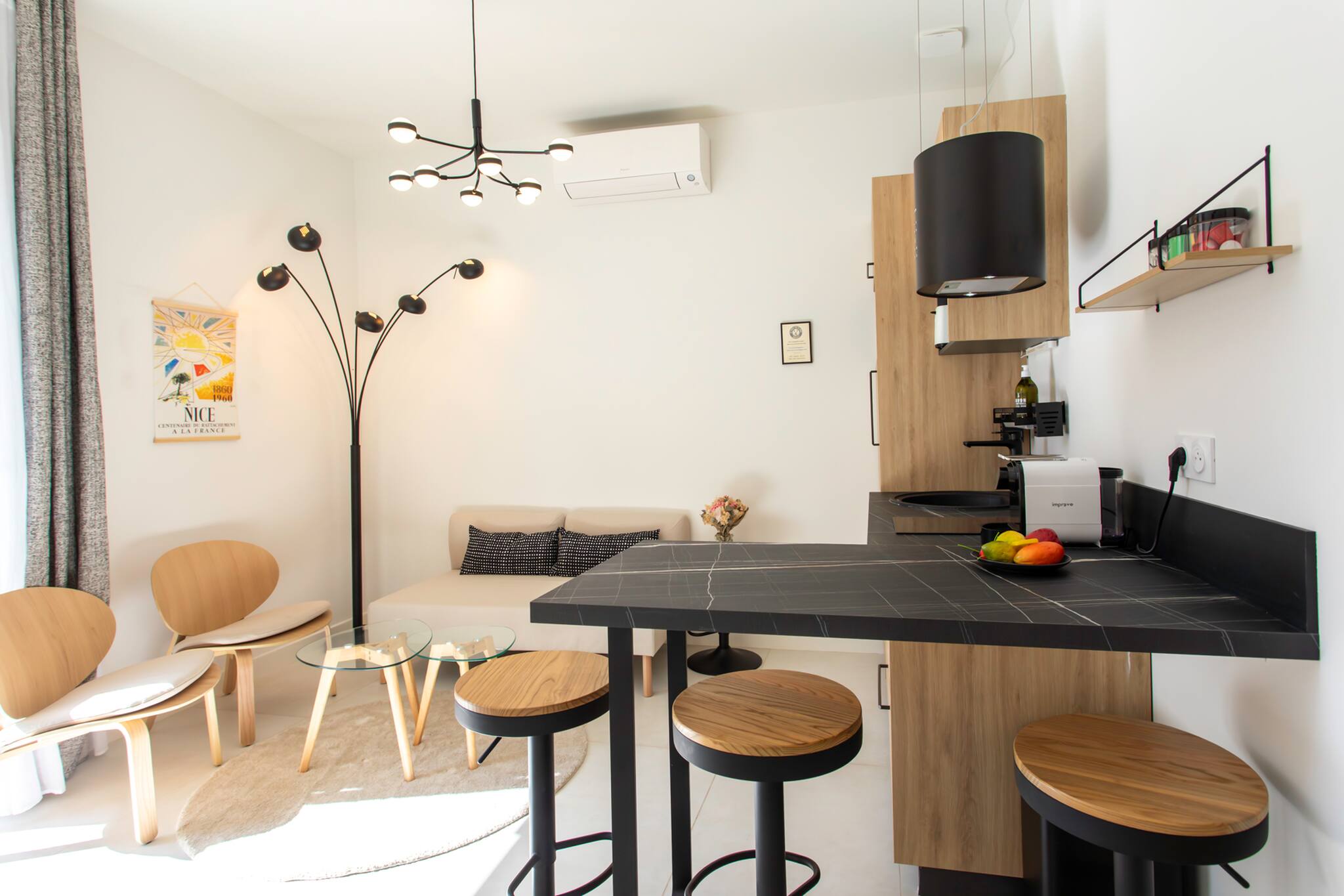 In the heart of the Carré d’Or, close to shops, the Promenade des Anglais, and the beach. The tramway and the sea are just a five-minute walk away. The apartment is fully equipped for optimal comfort, whether for a short or long stay, with Wi-Fi, storage, and everything you need to feel at home.