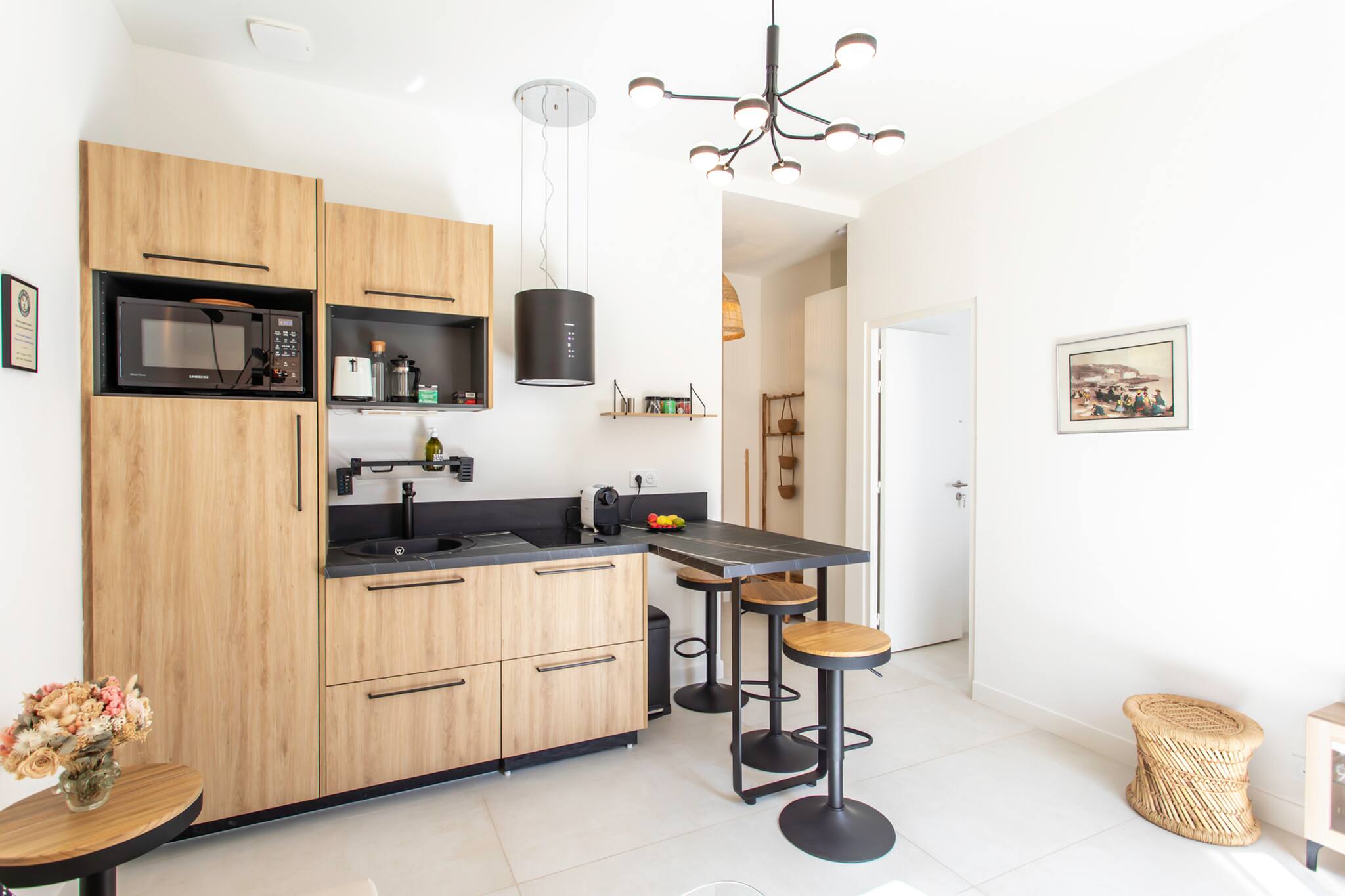 .Fully equipped kitchen: Fridge with freezer compartment, multifunction microwave oven, Nespresso coffee machine, toaster, sink, countertop, a cooking kit, dishes, cutlery, and storage spaces. Bar with four stools.
