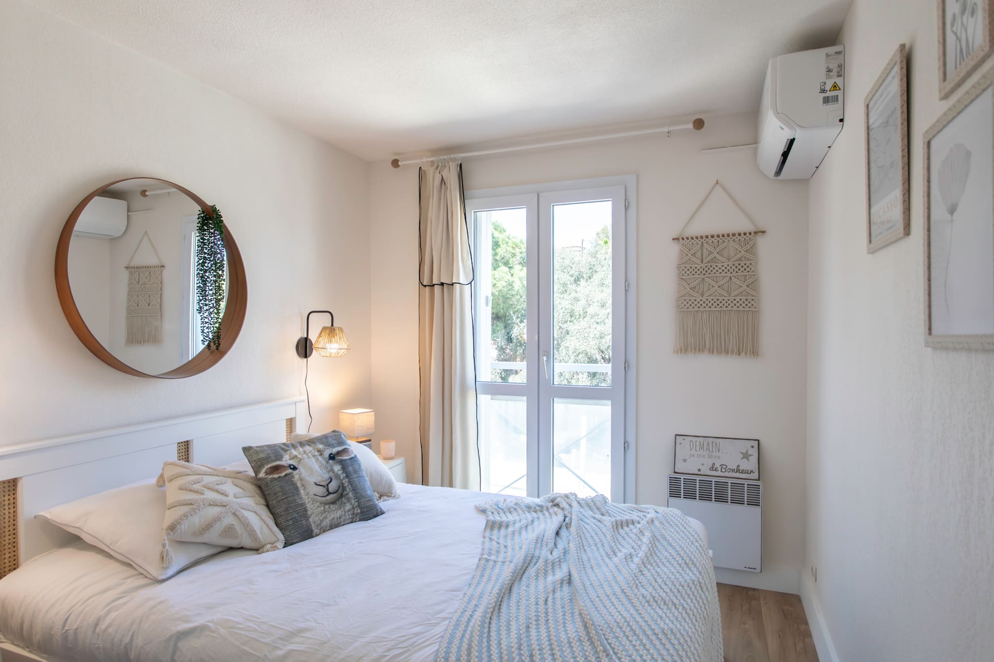 . One bedroom with a 140cm double bed, reversible air conditioning, bedside tables and lamps, reading lights, storage cupboard, mirror, double-glazed window overlooking the expressway, and light-filtering curtains