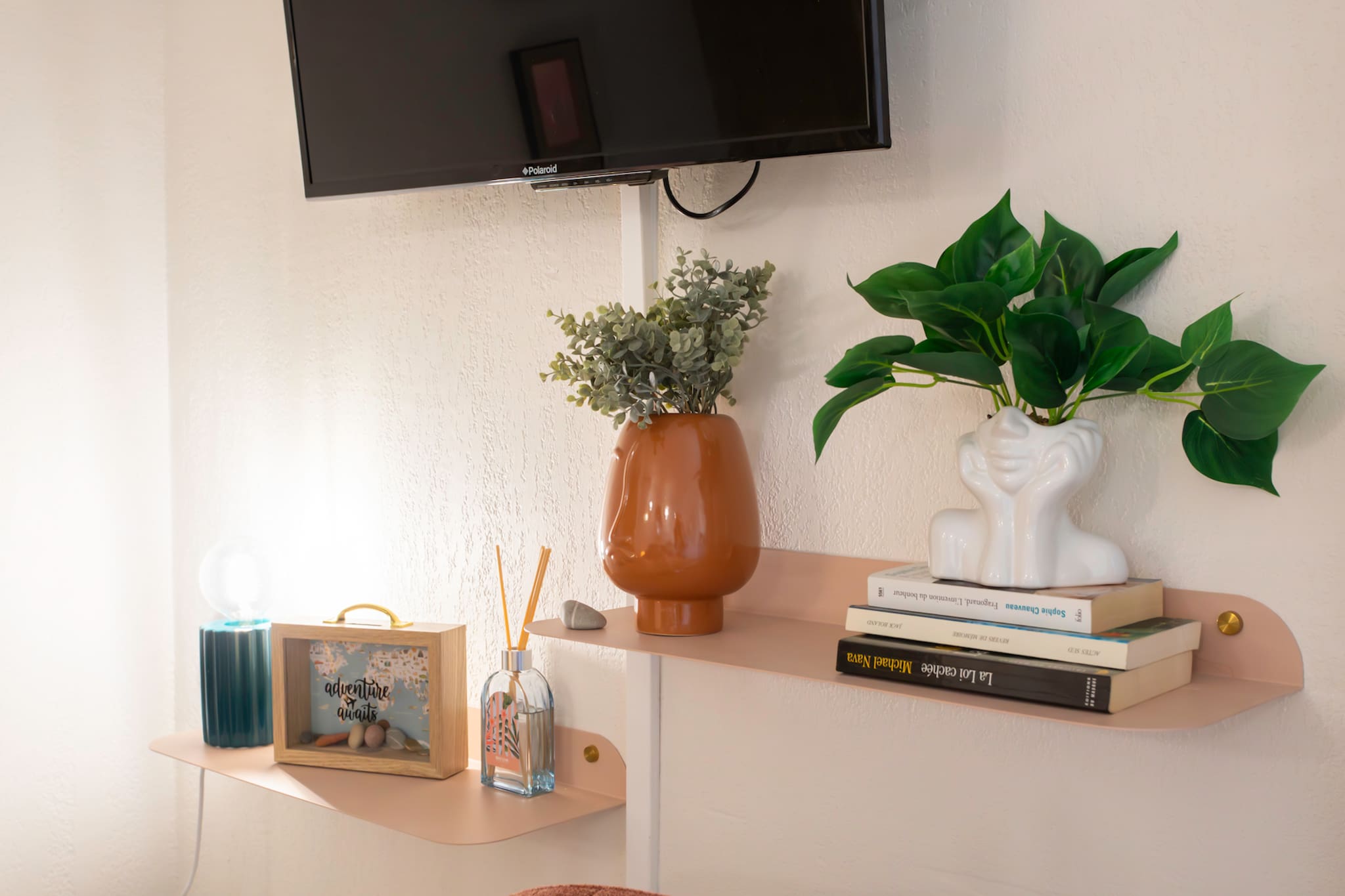 . A carefully decorated lounge area equipped with sofas, a TV and its console