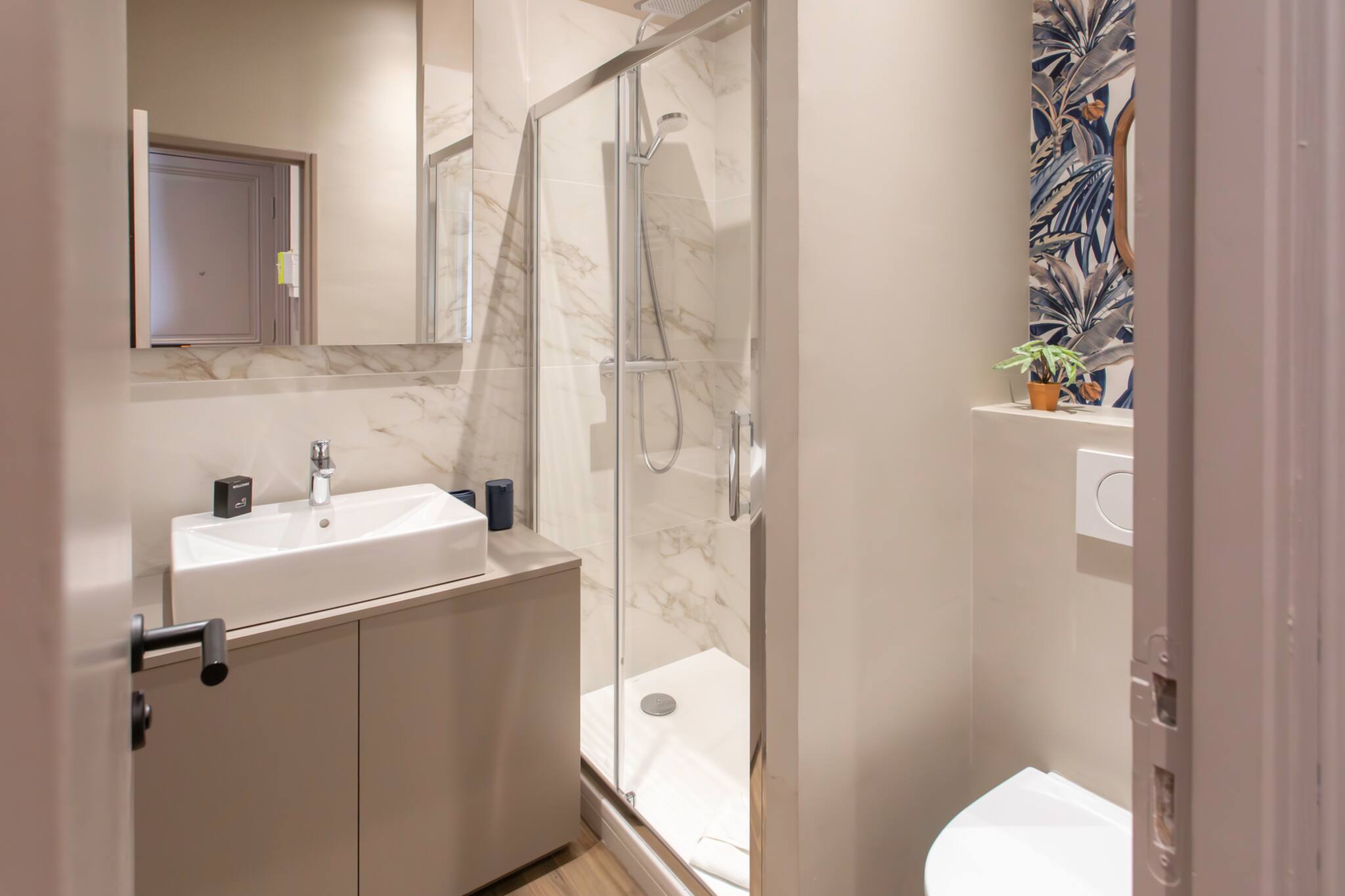 . A shower room equipped with a shower cabin, a washbasin, a hair dryer, mirrors and Wc
