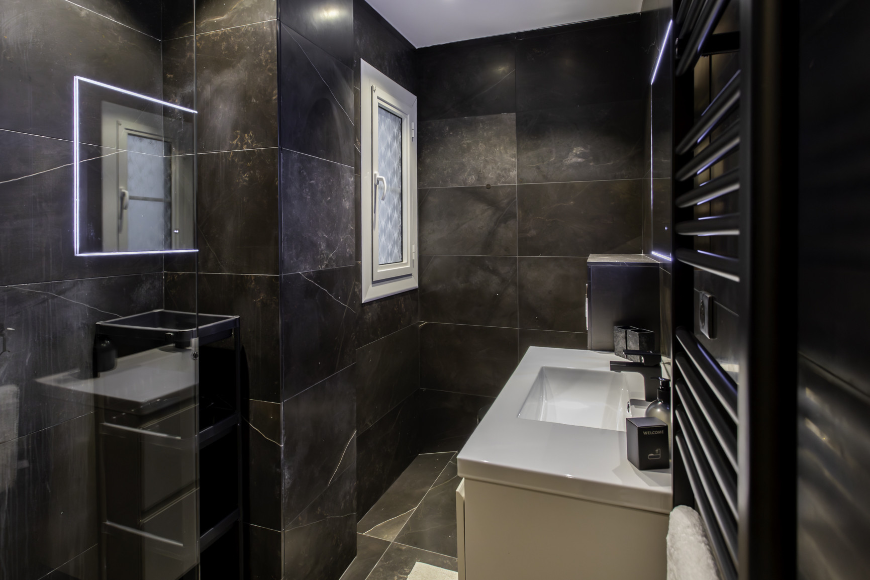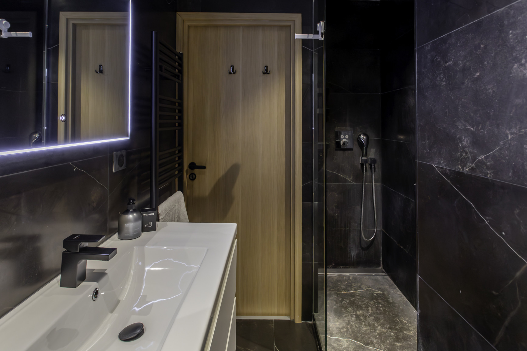 A first shower room equipped with a shower cubicle, a sink, mirror, hairdryer, towel dryer, storage and WC