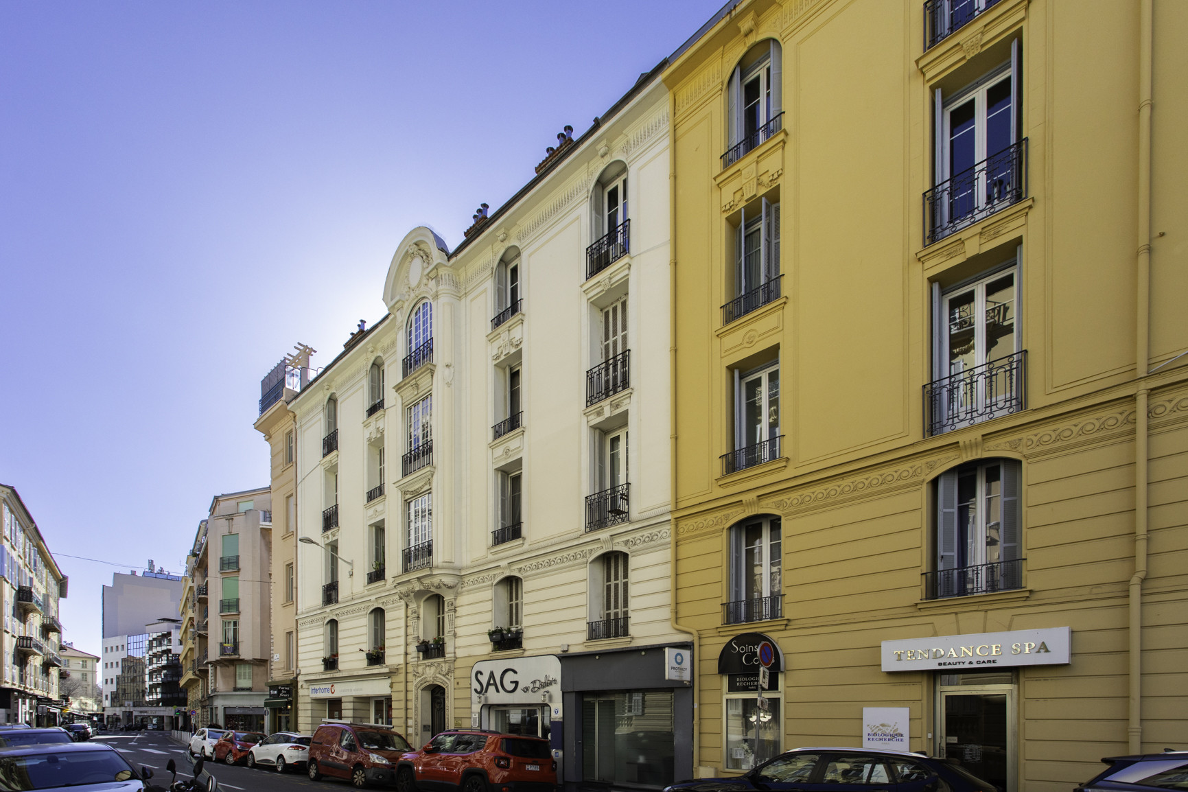 A first bedroom is equipped with a 140cmx190cm double bed, a bedside table and lamp, a storage closet, a desk and chair, and a double-glazed French window overlooking Boulevard Carlone with a light-filtering curtain.