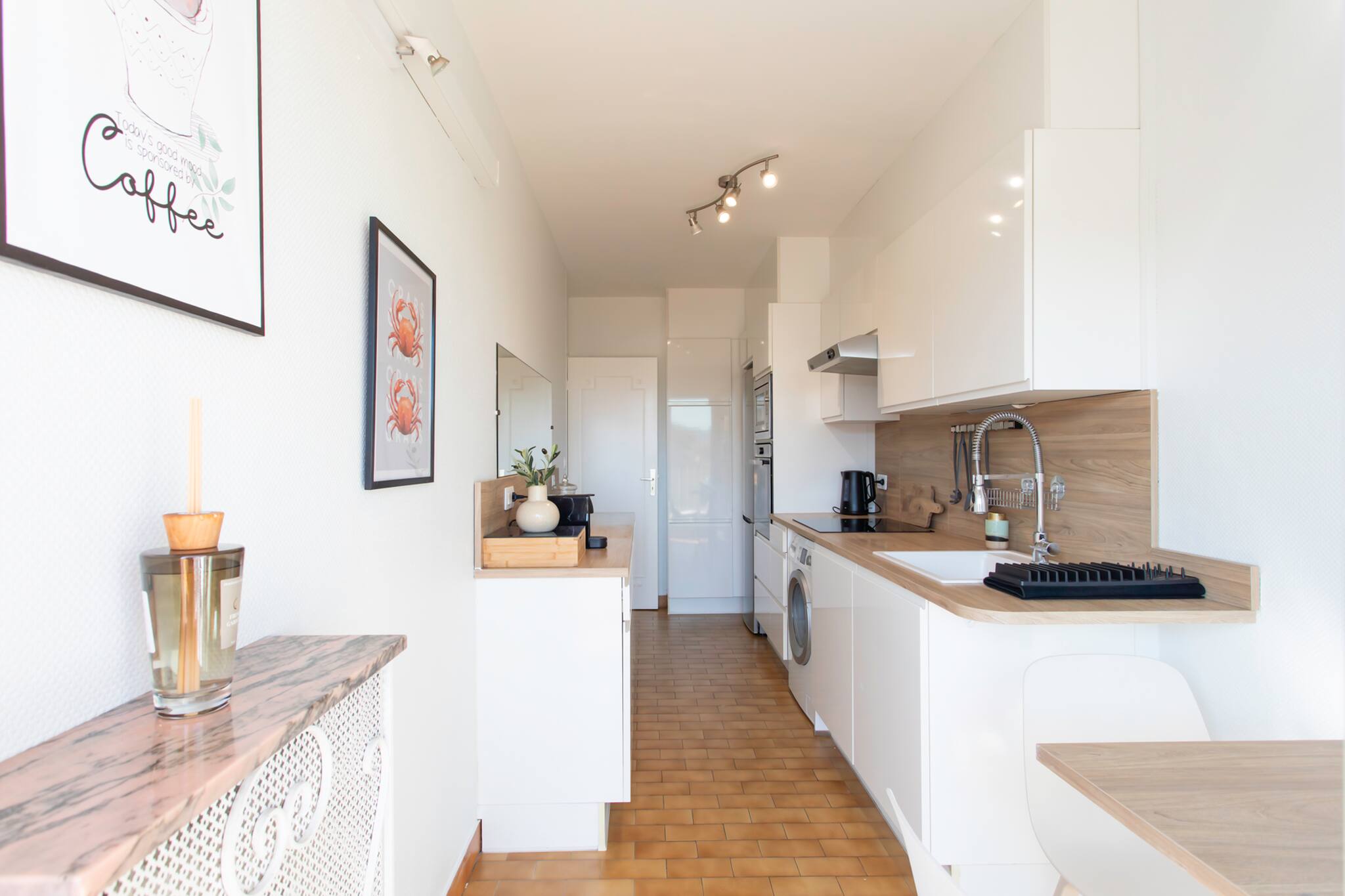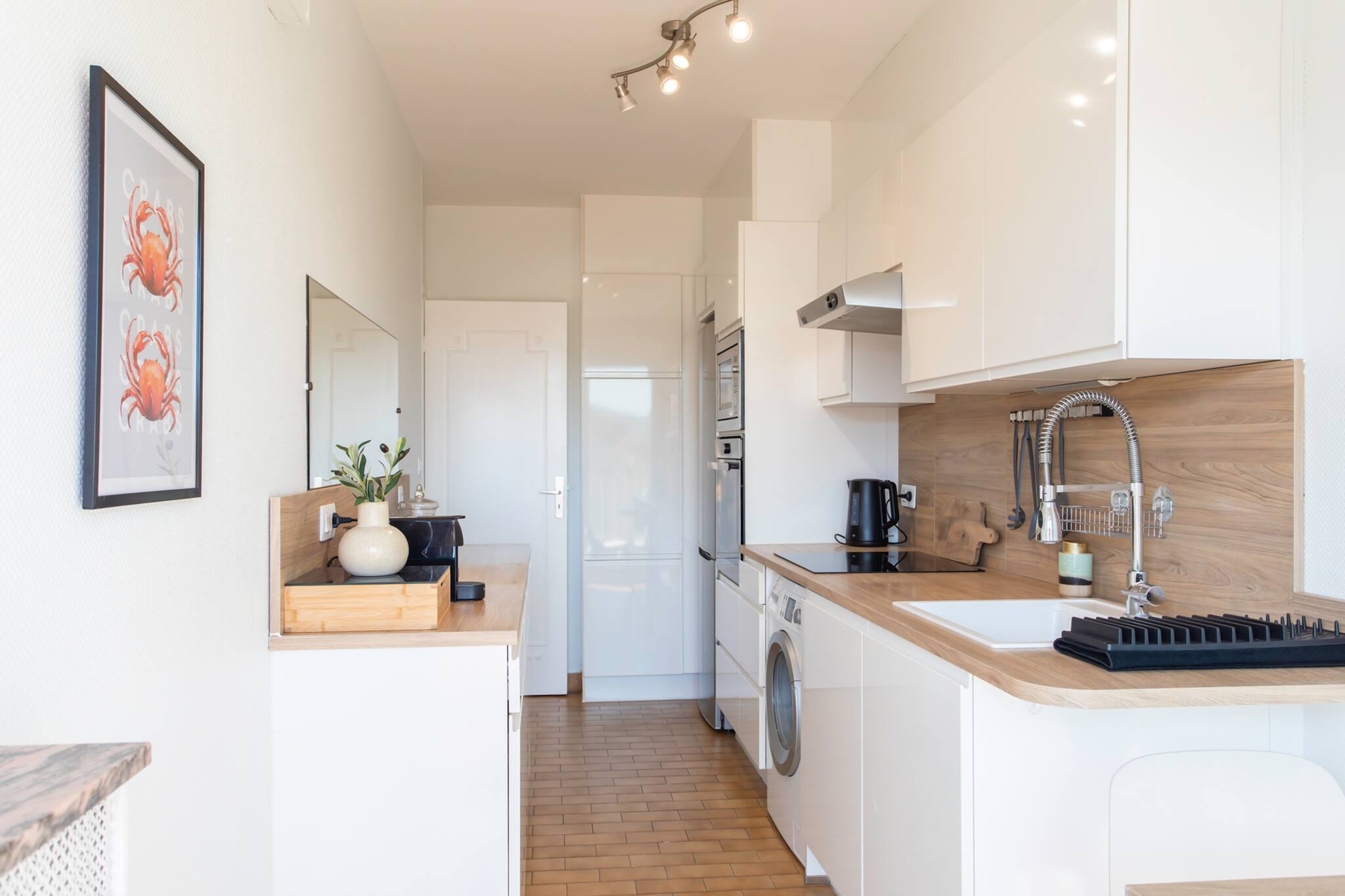 . A fitted kitchen open to the living room, equipped with storage unit, sink, worktop, induction hob, Nespresso coffee machine, electric kettle, toaster, with extractor hood, microwave, dishwasher, a set of crockery dishes and kitchen utensils