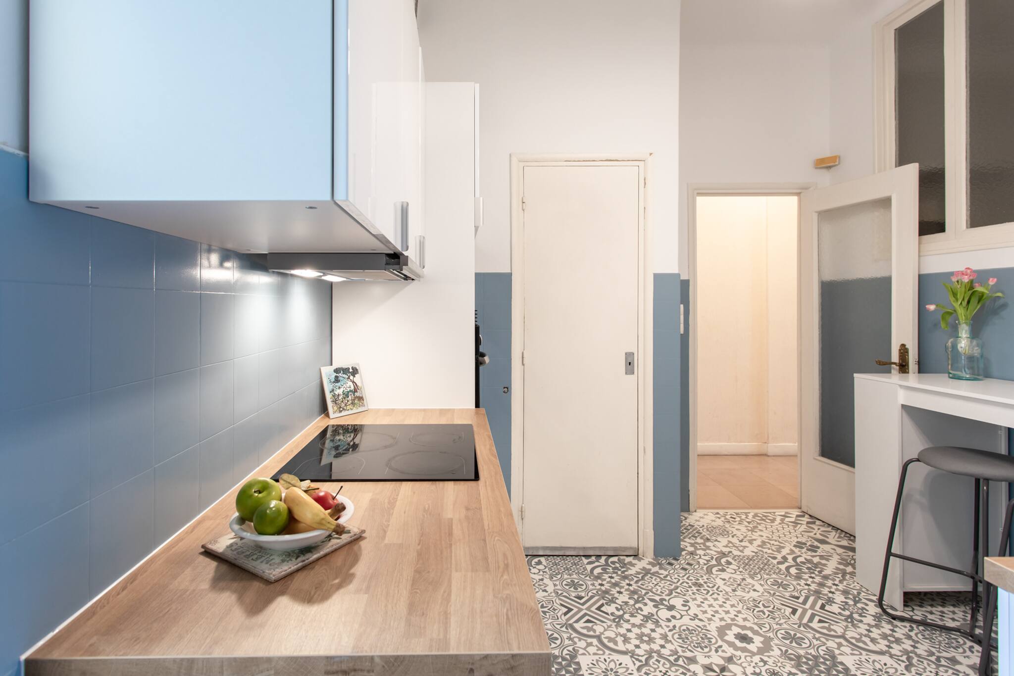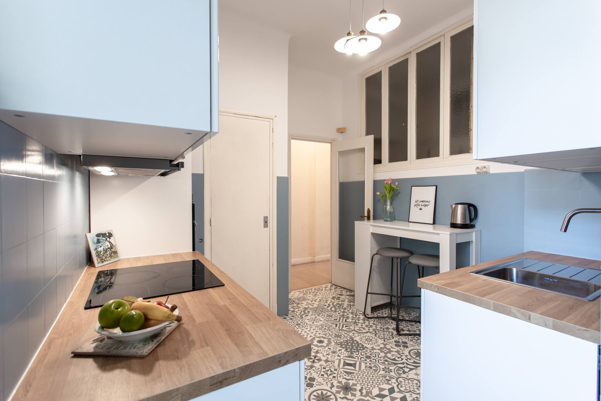 . A dining area with stools to take your meals for 2 people, chairs