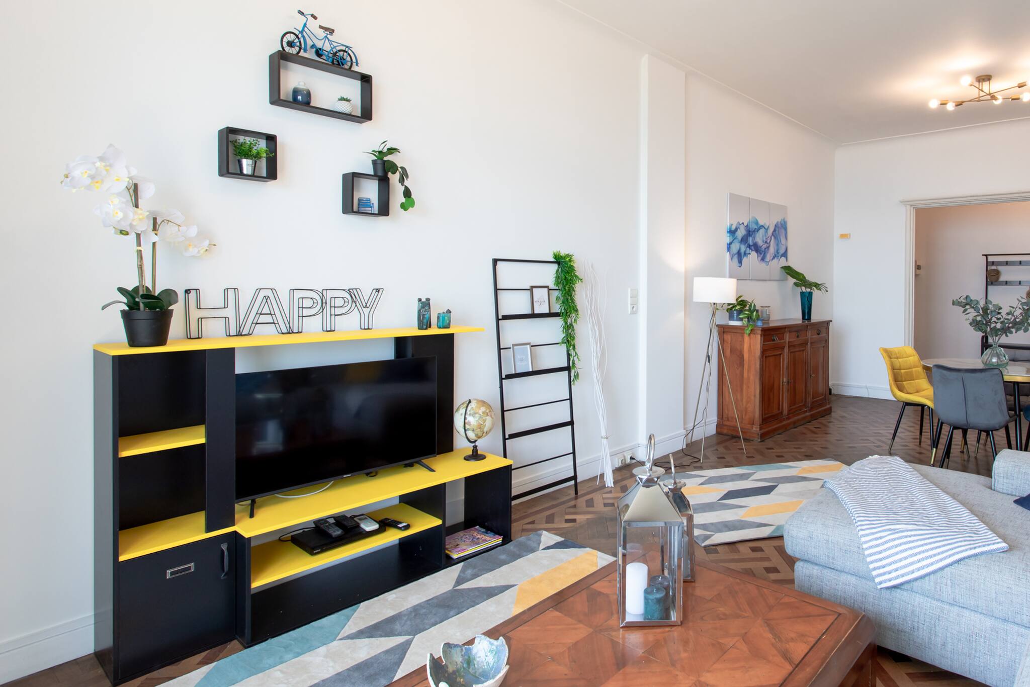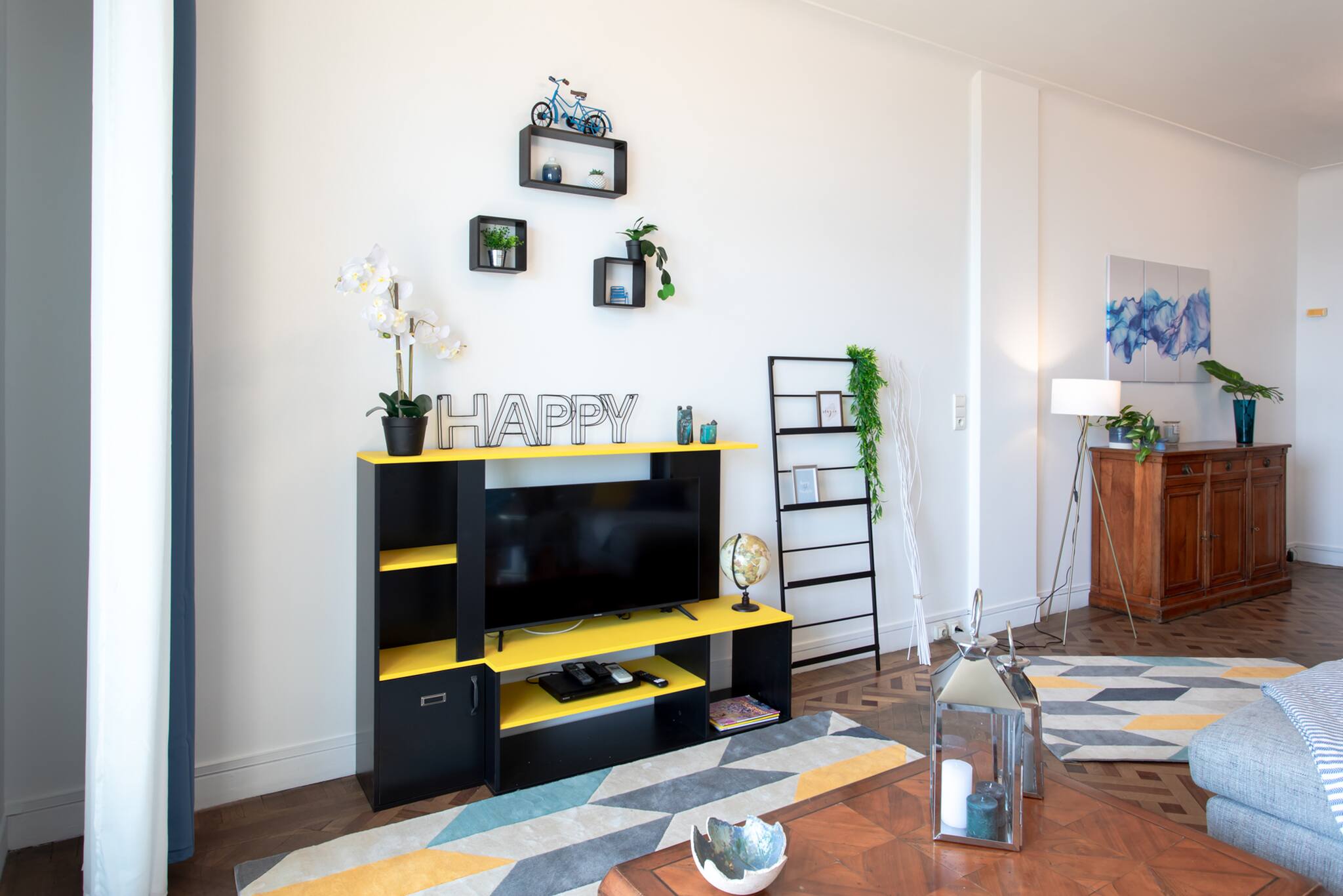 . A carefully decorated lounge area equipped with sofas, a TV and its console