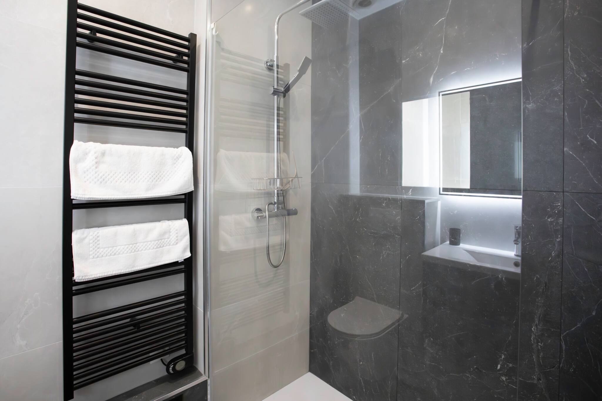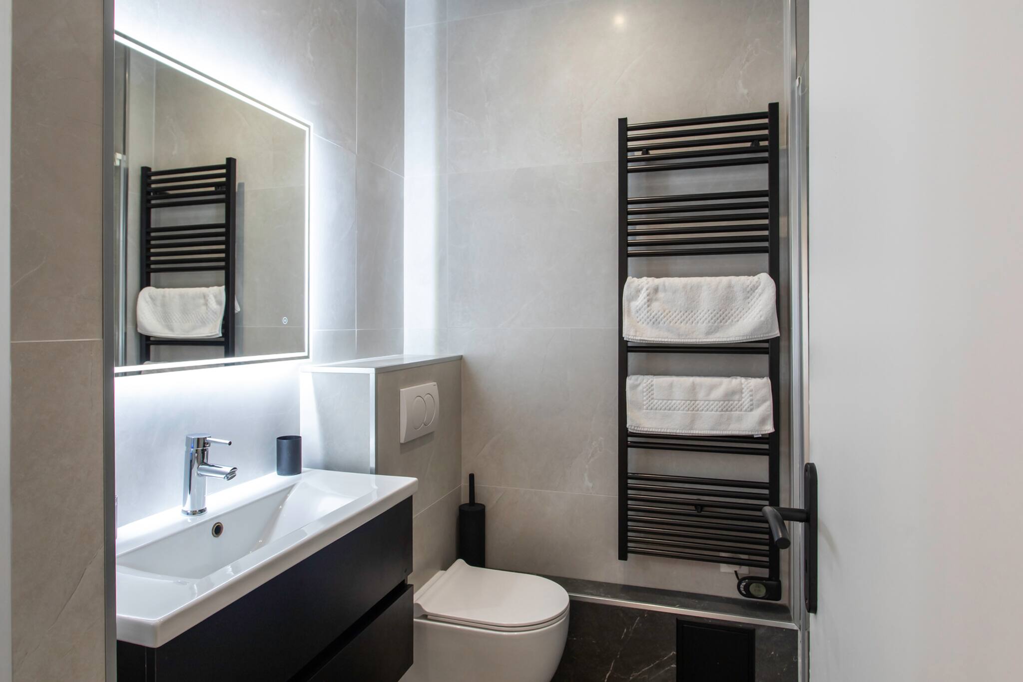 🚿 Main bathroom: shower, sink, hairdryer, towel warmer, and toilet