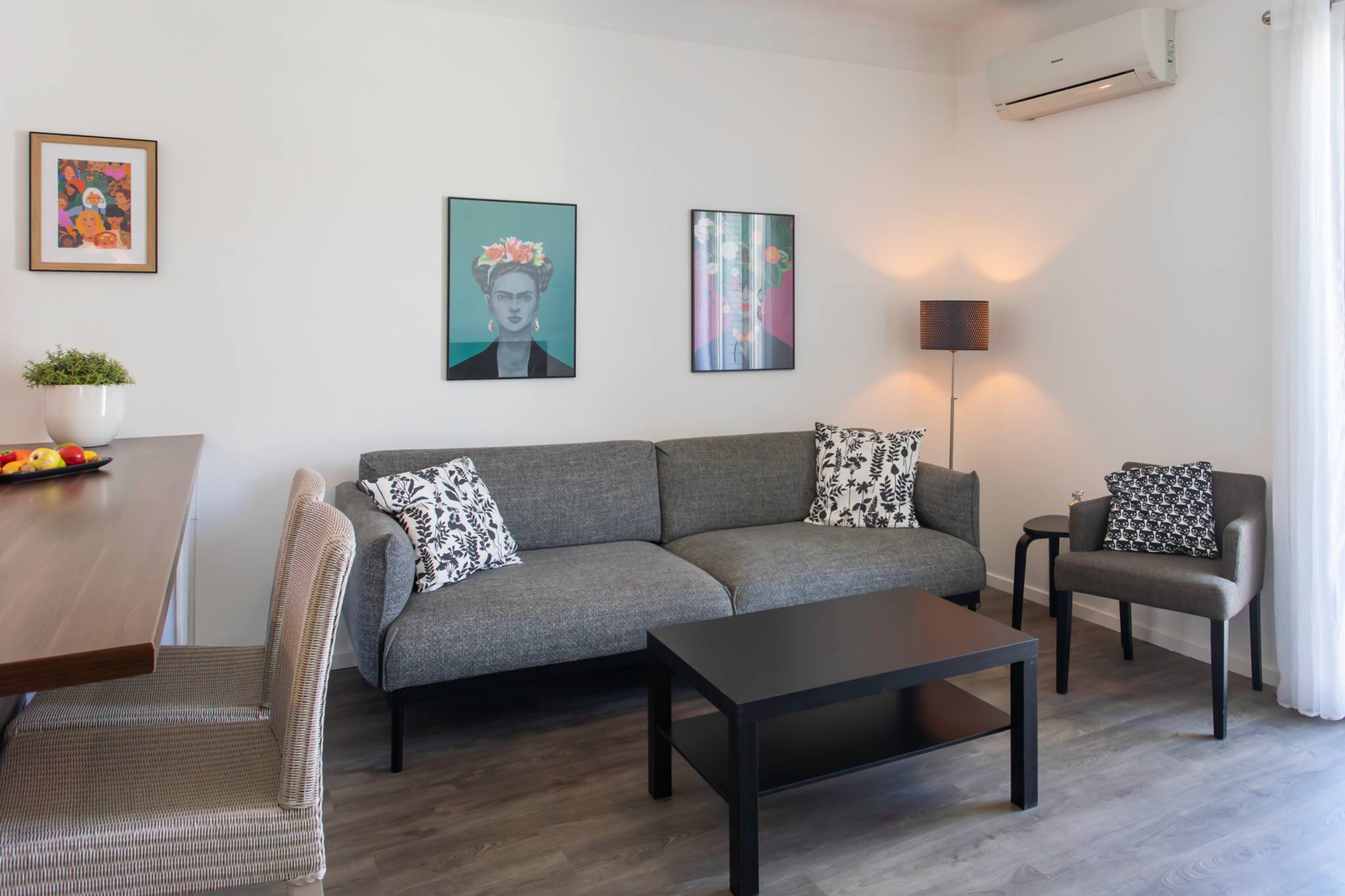 . A living room with three-seater sofa, TV, coffee table and reversible air conditioning