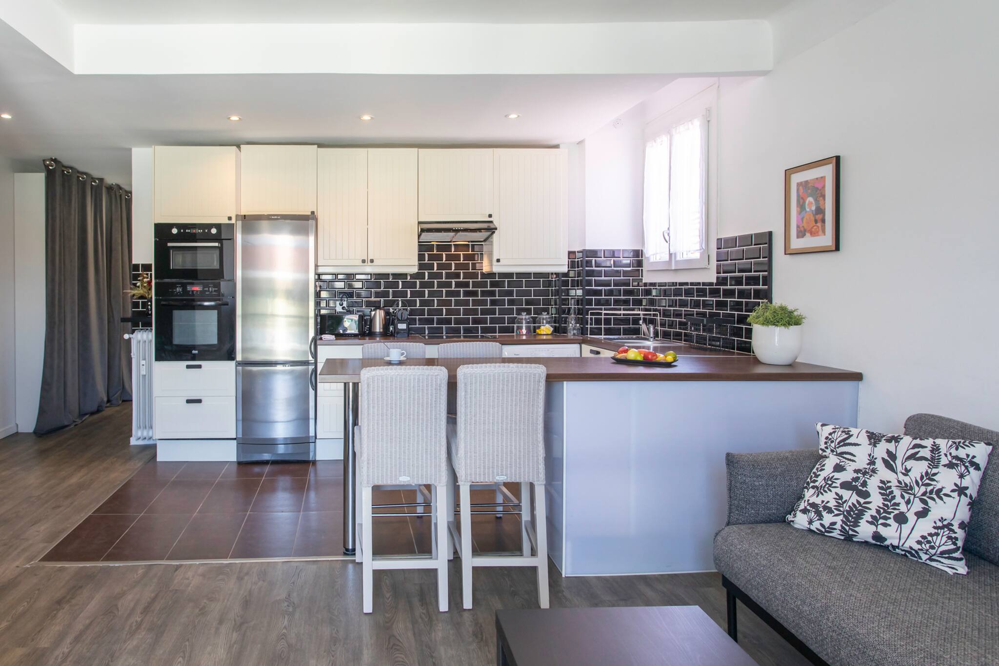 . A fitted kitchen open to the living room, equipped with storage unit, sink, worktop, induction hob, Nespresso coffee machine, electric kettle, toaster, with extractor hood, microwave, dishwasher, a set of crockery dishes and kitchen utensils