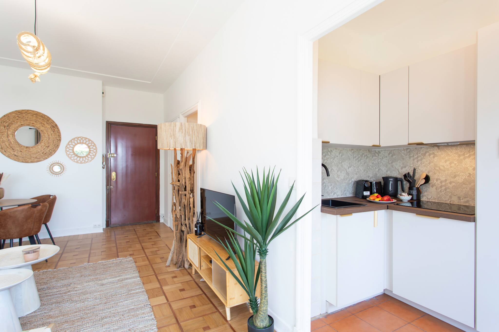 . A fully equipped kitchen open to the living room: fridge, freezer compartment, microwave oven, Nespresso coffee maker, electric kettle, toaster, sink, worktop, a cooking kit, crockery, cutlery and storage space