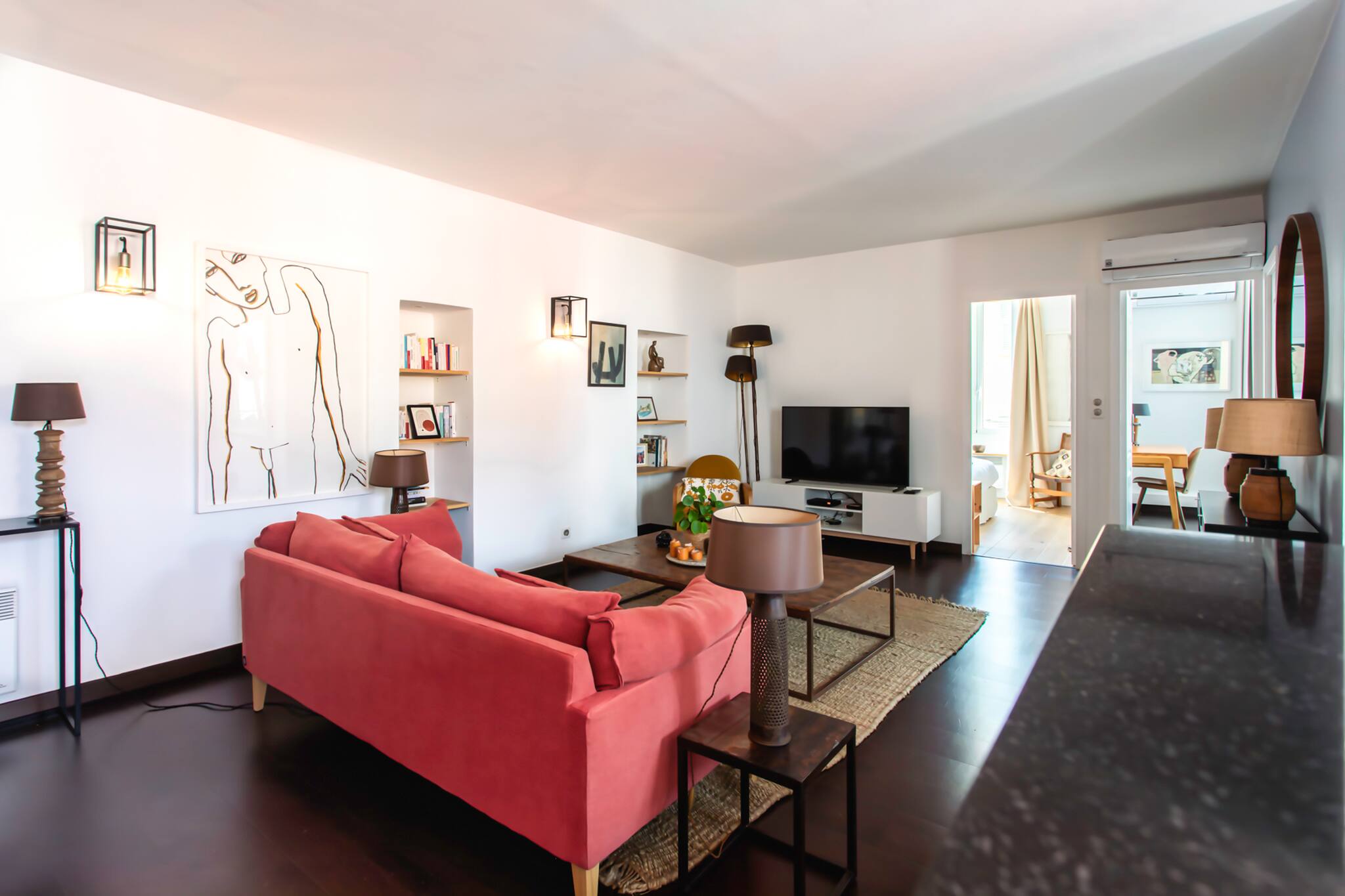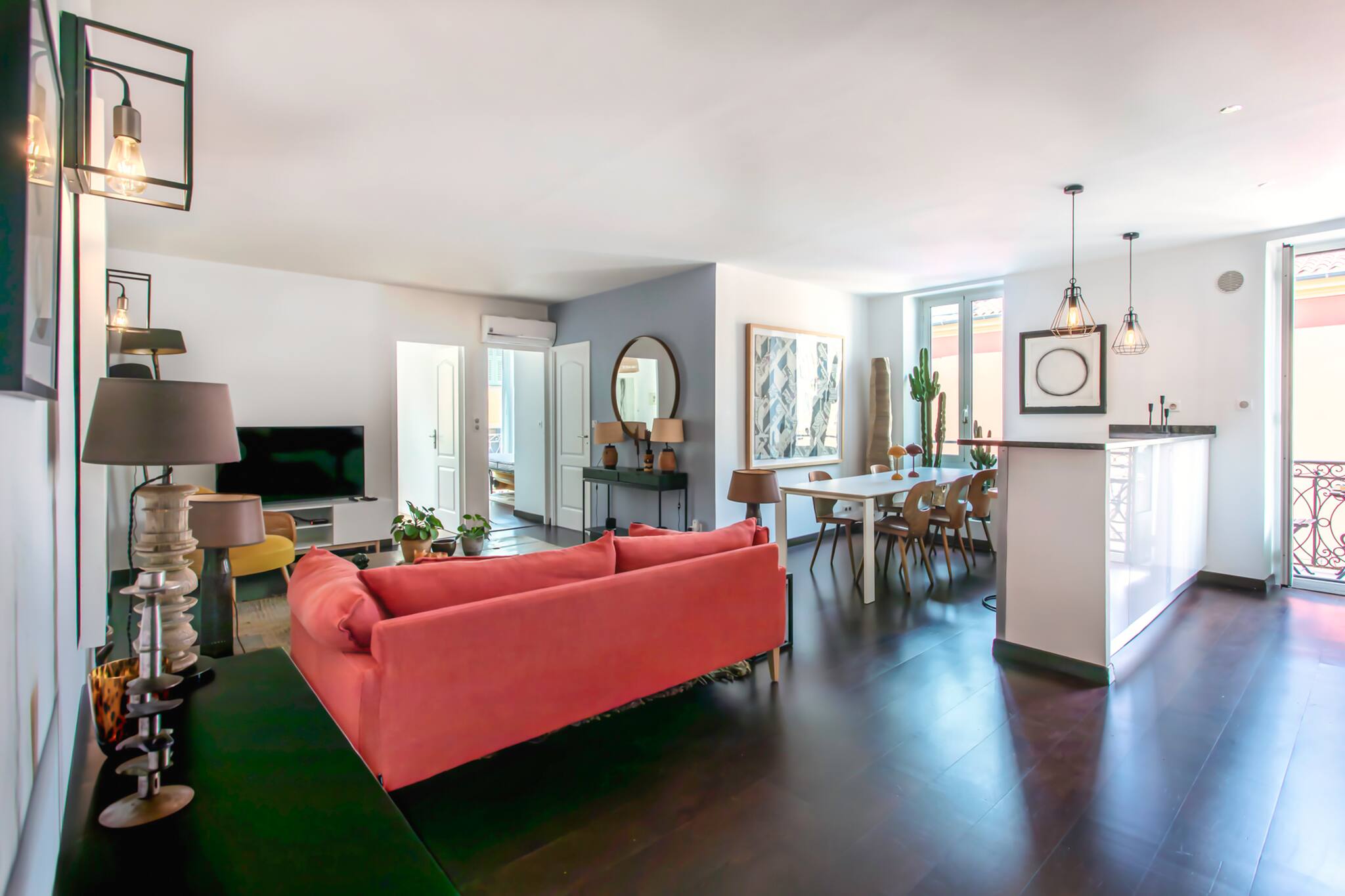 The Orange Suite is located at 3 mins walk from the sea and the Promenade des Anglais. Located on the 4th floor by stairs. It is equipped with all amenities for your stay: large living room with sofa, TV, reversible air conditioning, dining area, wifi, bedroom double bed 160cm + Ac, bedrooms bunk beds 90cm + AC, sea view balcony and dining table, kitchen equipped, shower room with WC and bidet. Ideal accommodation to enjoy the best of Nice with your family.