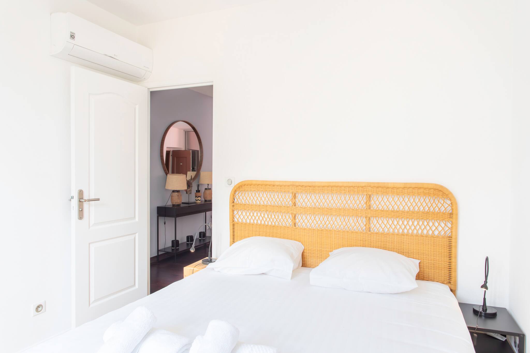 . A first bedroom with double bed 160x200cm, with bedside tables, cupboard and reversible air conditioning, window onto the street with double glazing