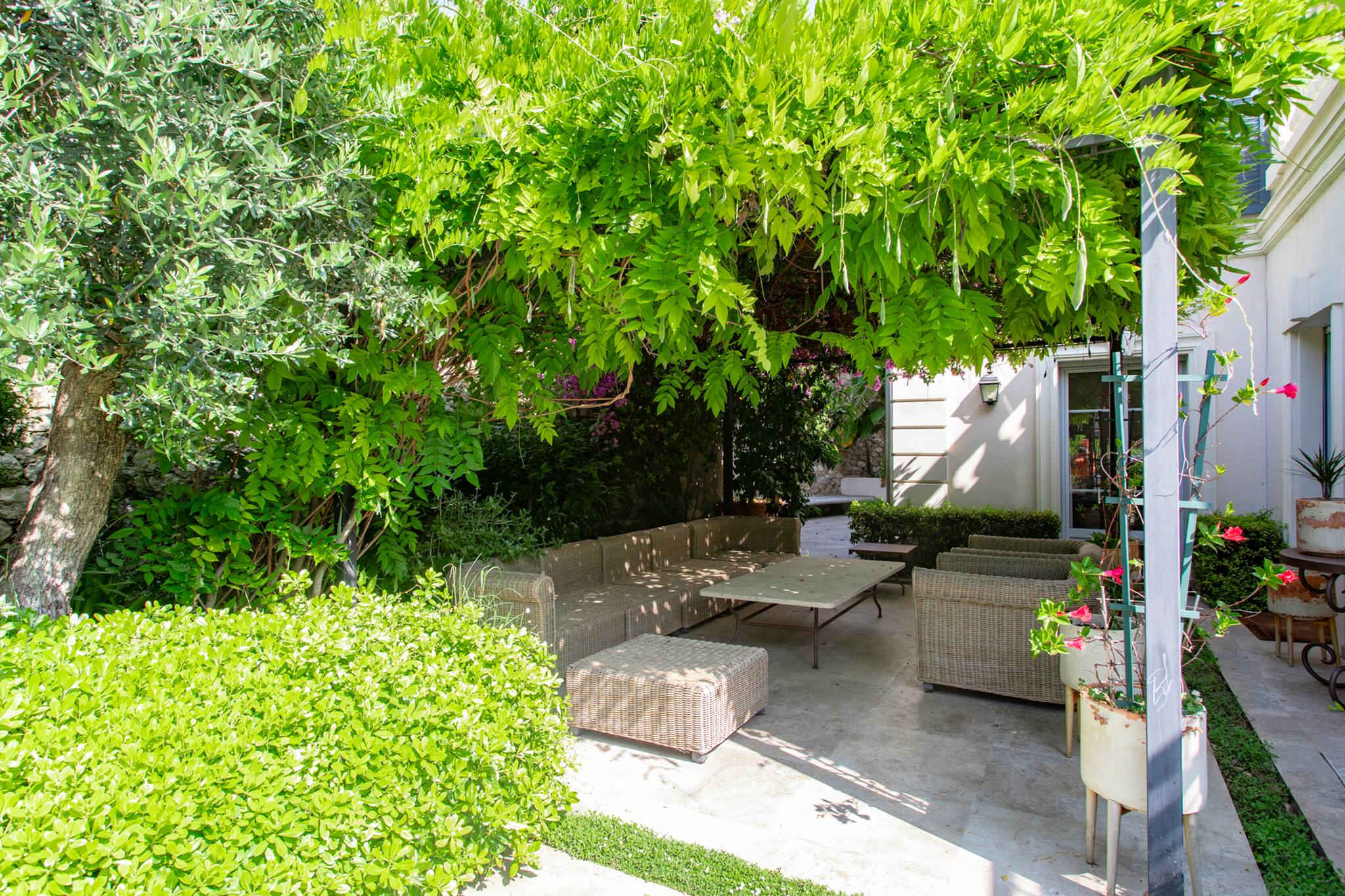 . A large garden furniture set with a coffee table under a tree-lined area for protection from the sun.