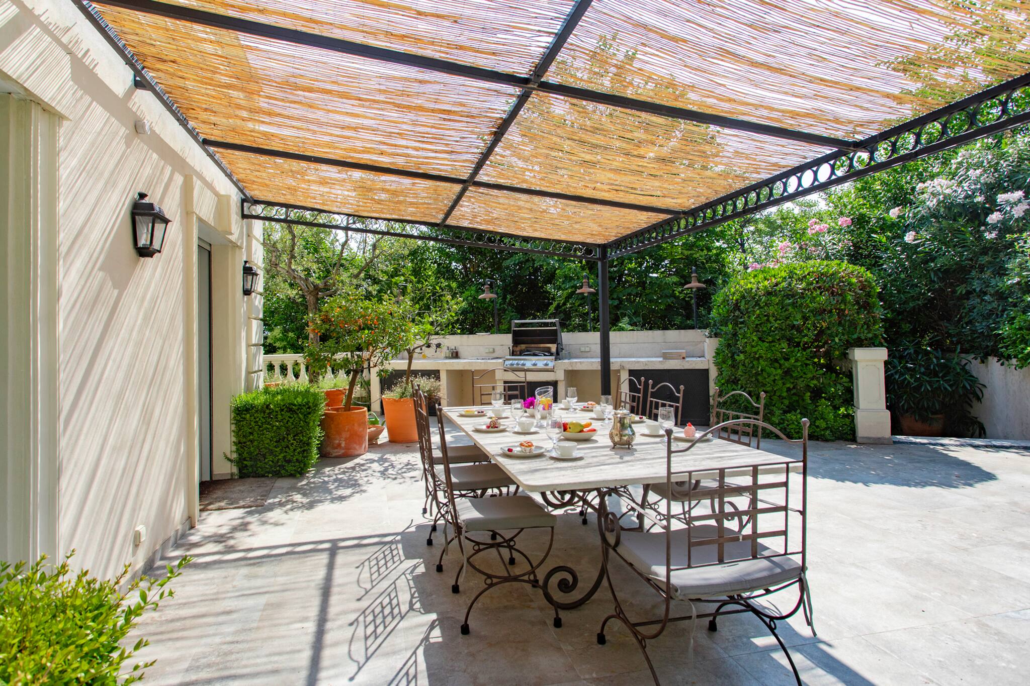. A main terrace shaded by reed screens, equipped with a dining area for 8 people, outdoor lighting, and a pool view.