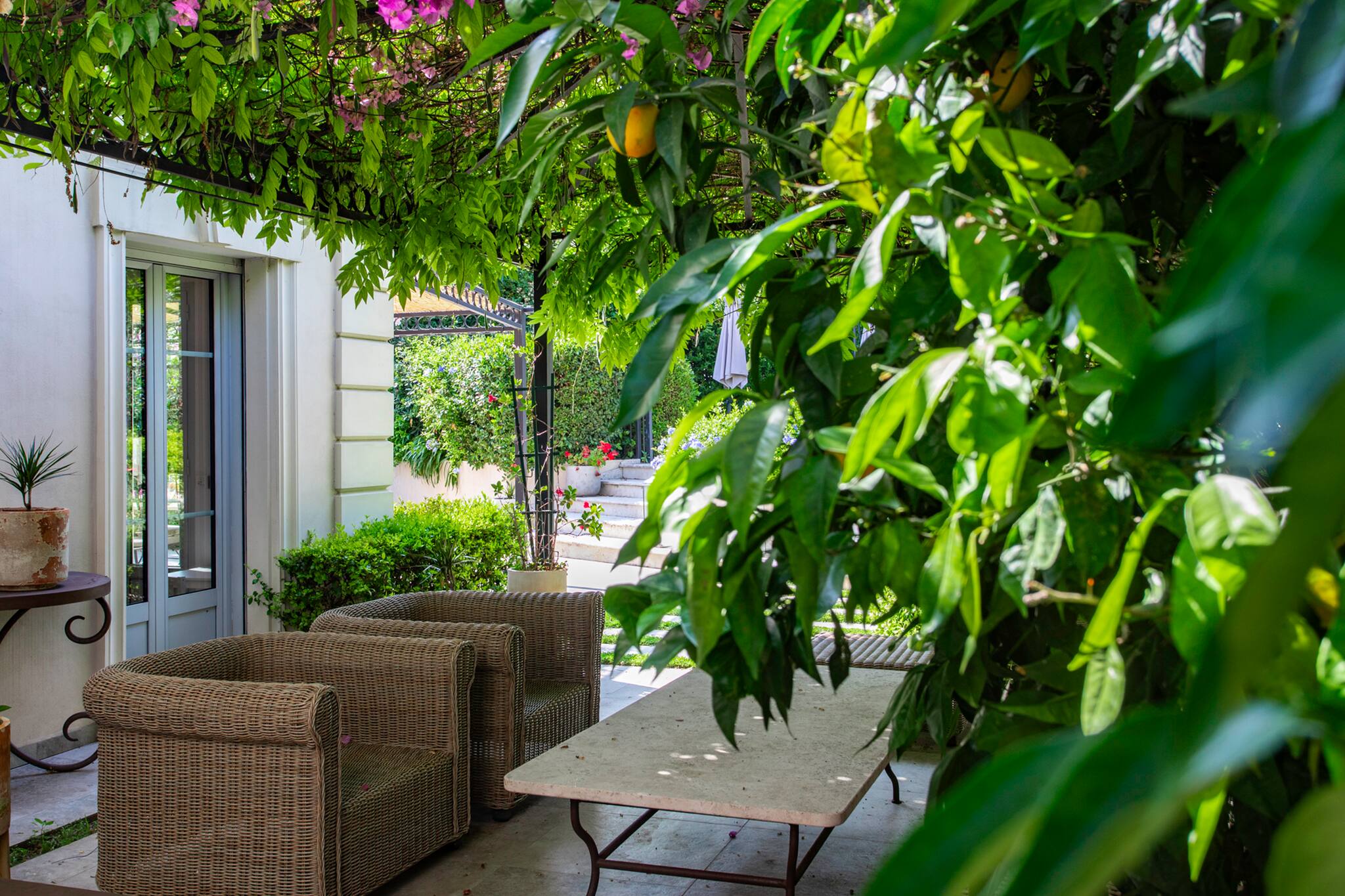 The master bedroom's private terrace features a patio furniture set that can accommodate 6 people and a parasol. It offers a splendid view of the sea and the mountains, as well as the garden, the pool, and the railway line.