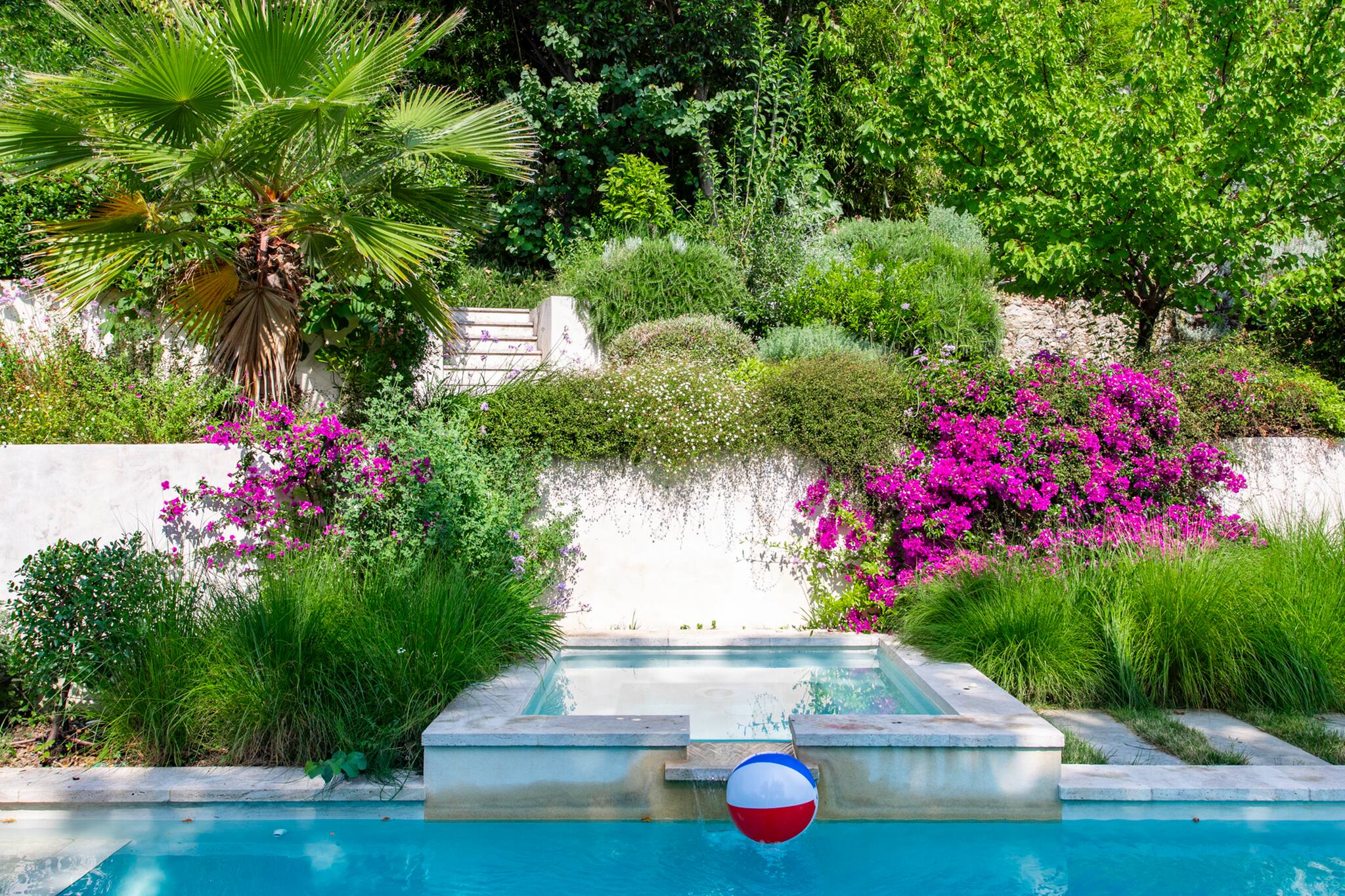 . Flat, terraced grounds all around the house, partially grassed (pool side).