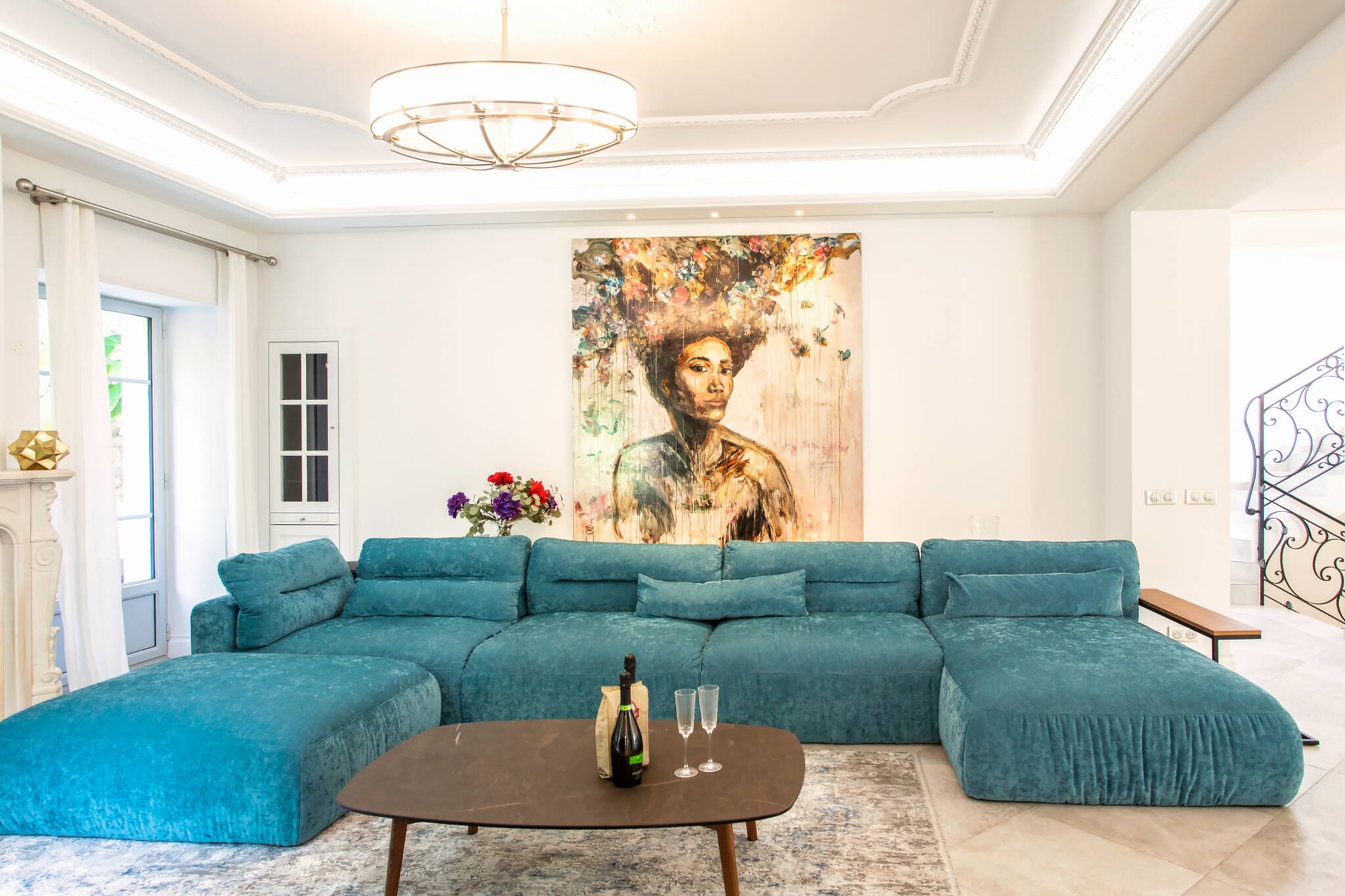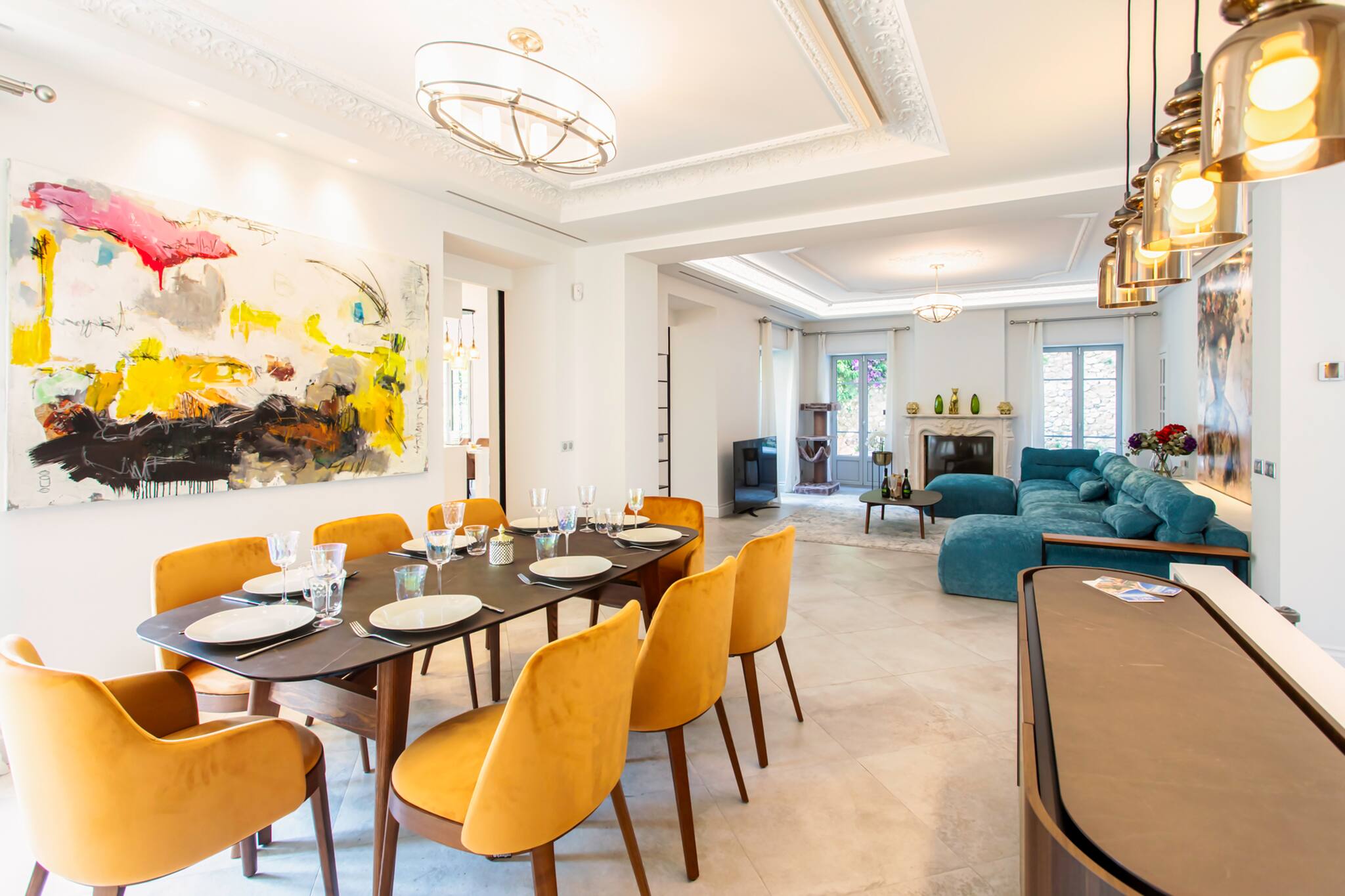 A large living room with a decorative fireplace, large corner sofa, TV coffee table, and double-glazed French doors opening onto a terrace.