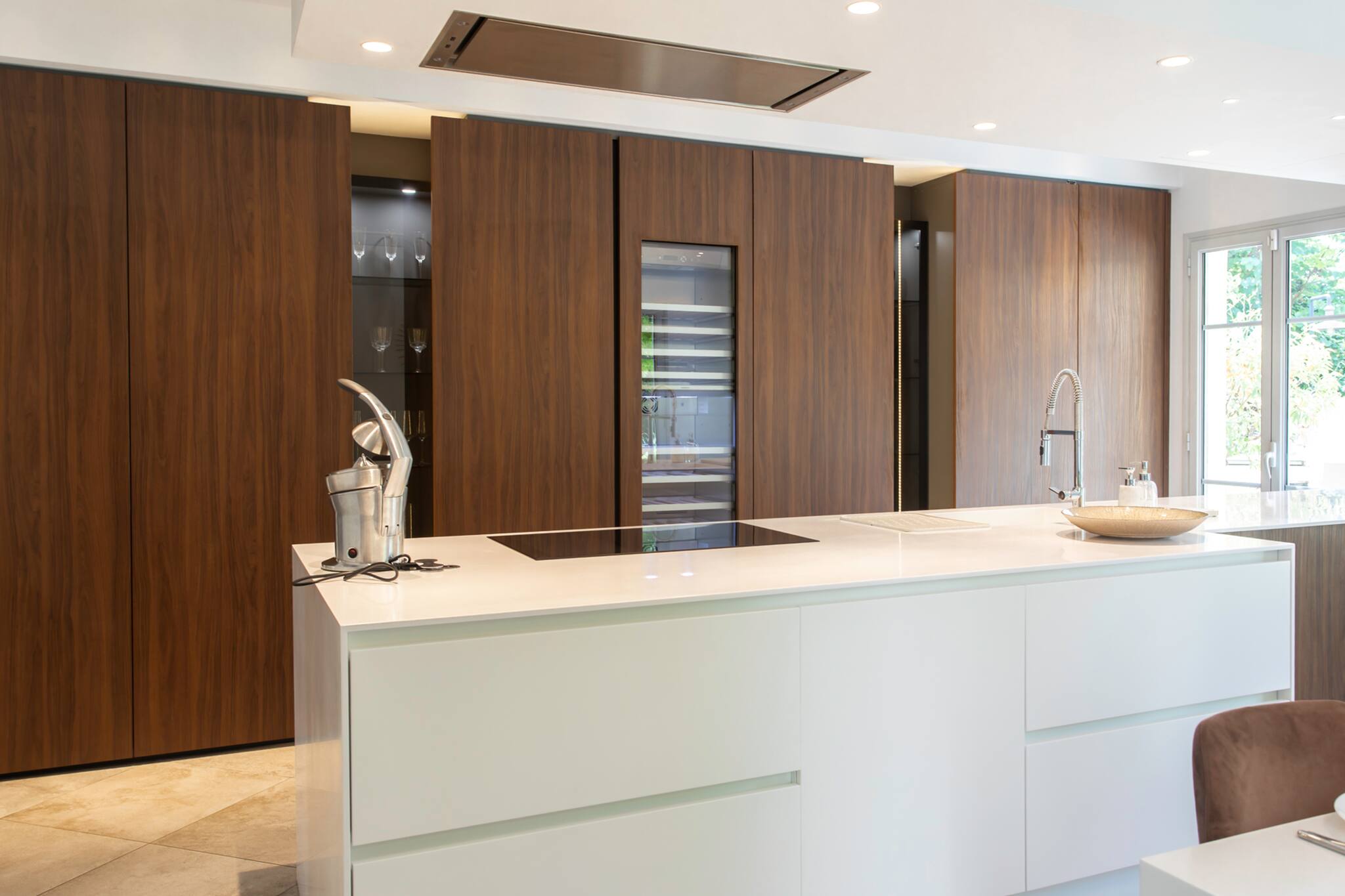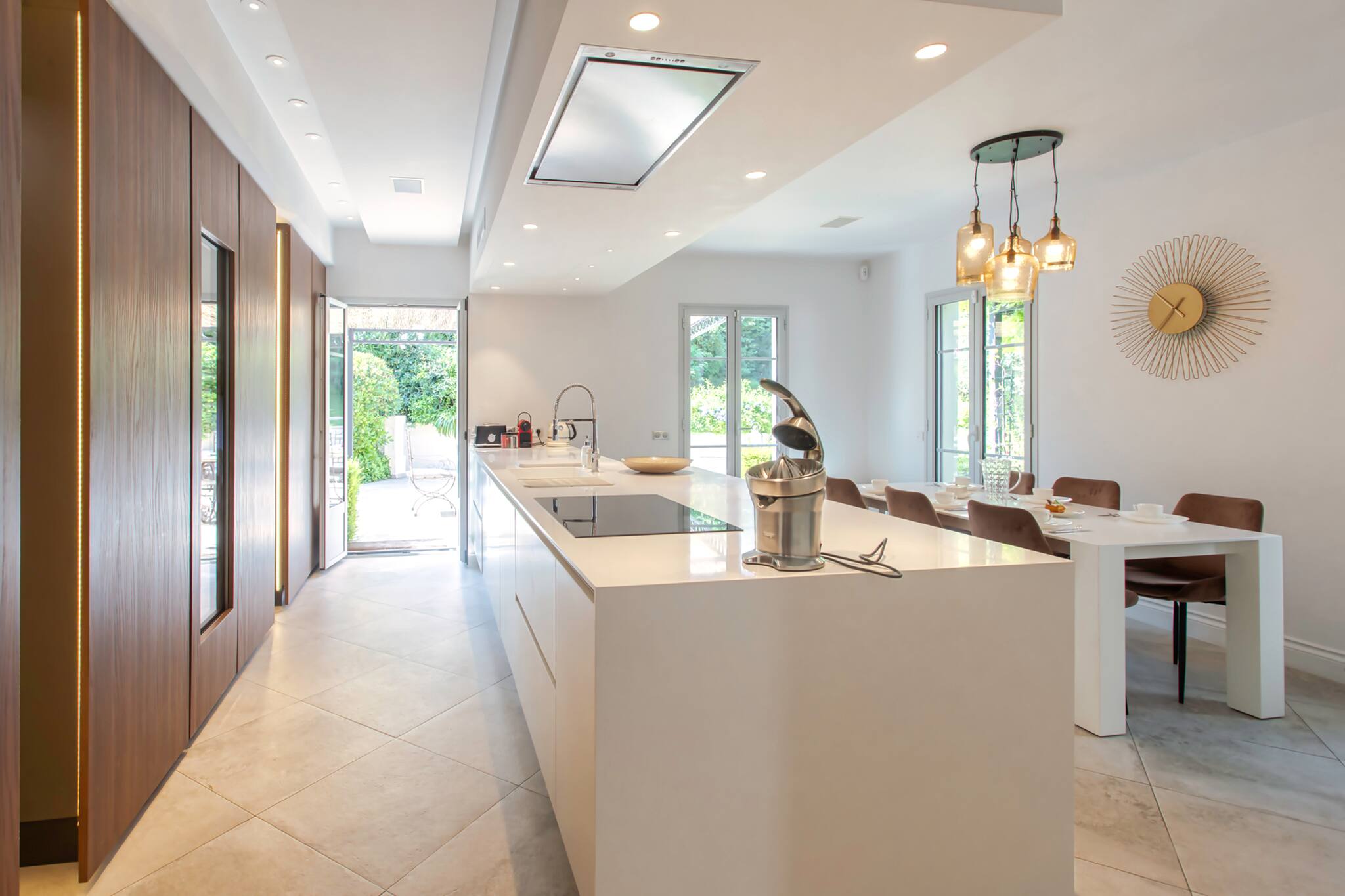 A large, fully equipped kitchen with storage units, a sink, countertop, induction hob, extractor hood, Nespresso coffee machine, electric kettle, toaster, microwave, a set of dishes, crockery, and kitchen utensils, a dishwasher, a table for 6 with chairs, and double-glazed French doors providing access to the house's terraces.
