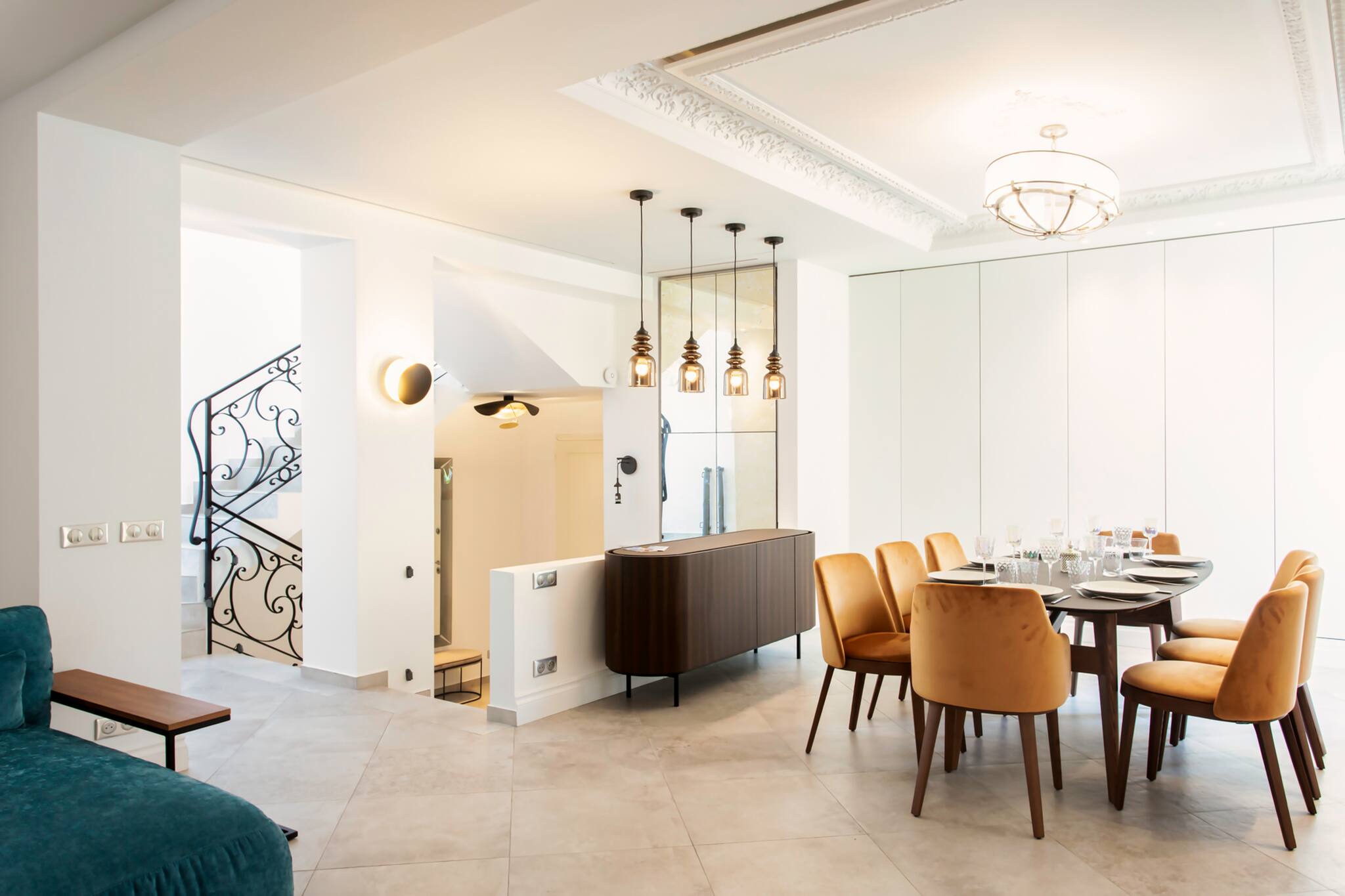 A dining area with a table and chairs for 8 guests, a serving trolley, and storage cupboard. A double-glazed French door provides access to the terrace.