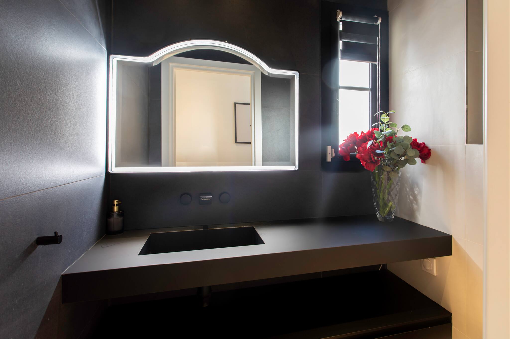 The third bathroom is equipped with: a sink with a mirror, a shower stall, a toilet, a hairdryer, a heated towel rail, storage, and a double-glazed window overlooking the courtyard.