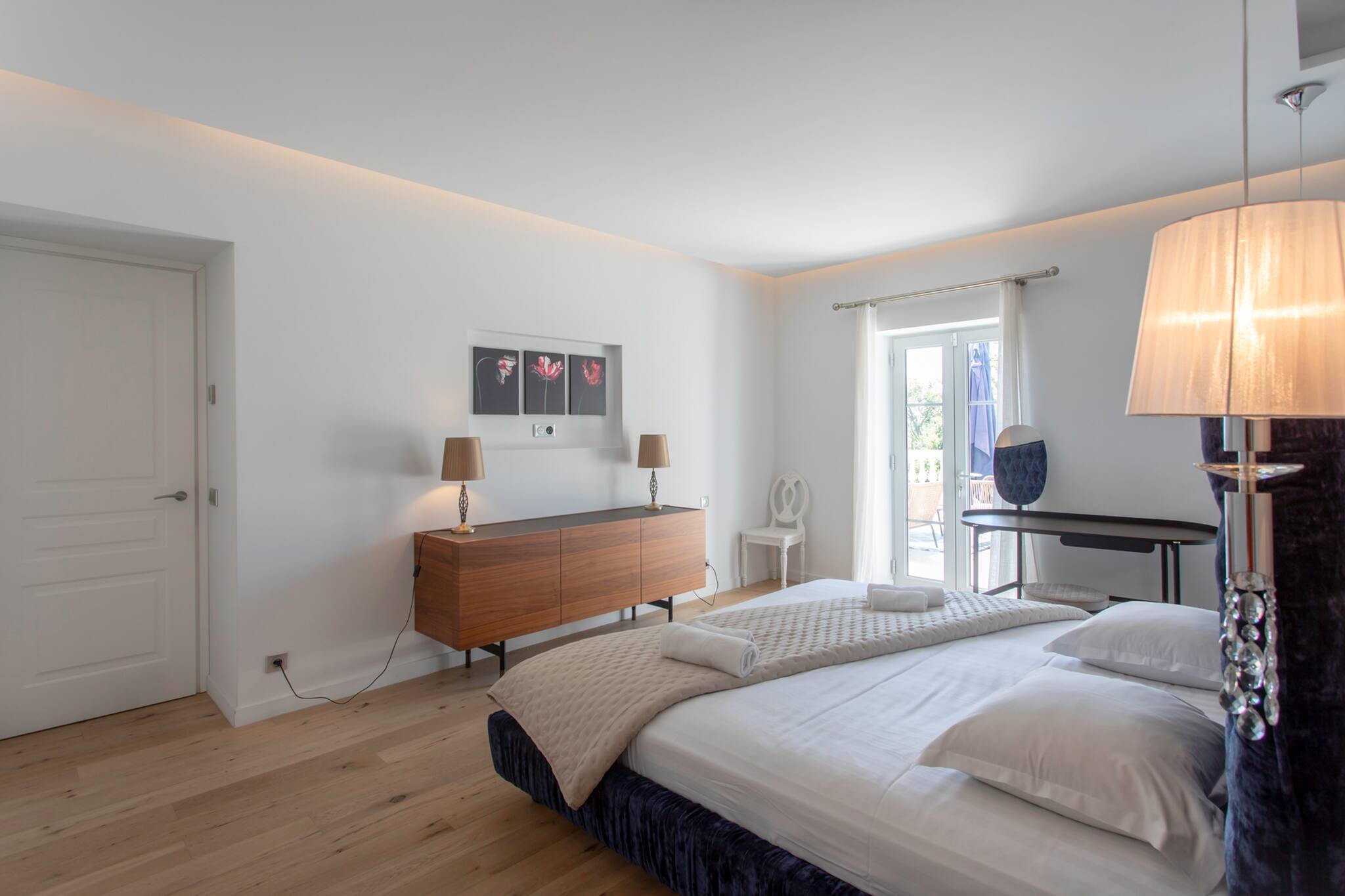 A master bedroom equipped with a 200cmx200cm double bed, bedside tables, bedside lamps, a walk-in closet, a vanity unit with stool, and a chair, double-glazed French doors opening onto a private terrace, and a private bathroom.