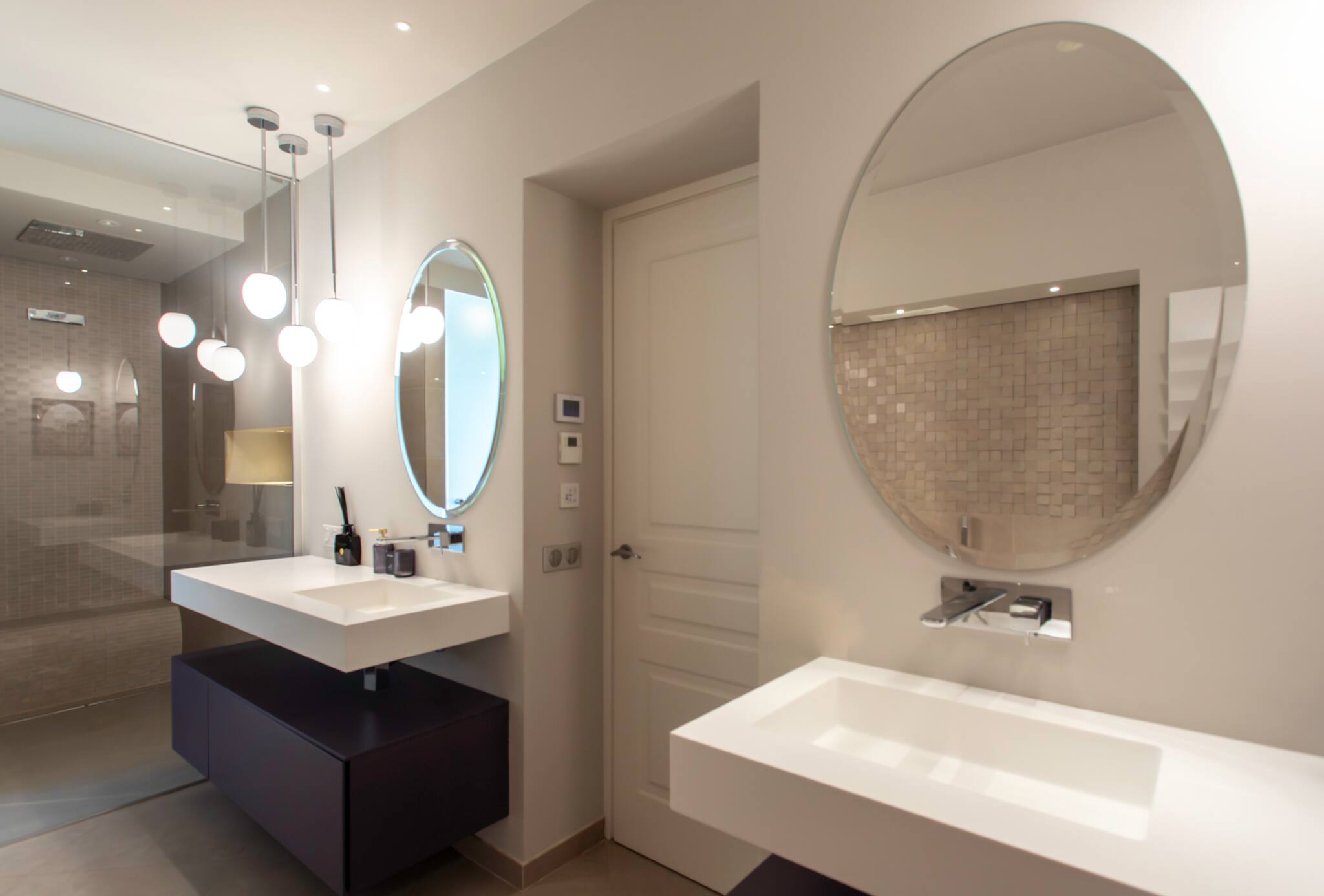 The master bedroom's bathroom offers every comfort, including a sink and mirror, a large shower stall with a bench, a bathtub, a separate toilet, a hairdryer, a heated towel rail, a mirror, storage, and a double-glazed window overlooking the courtyard.