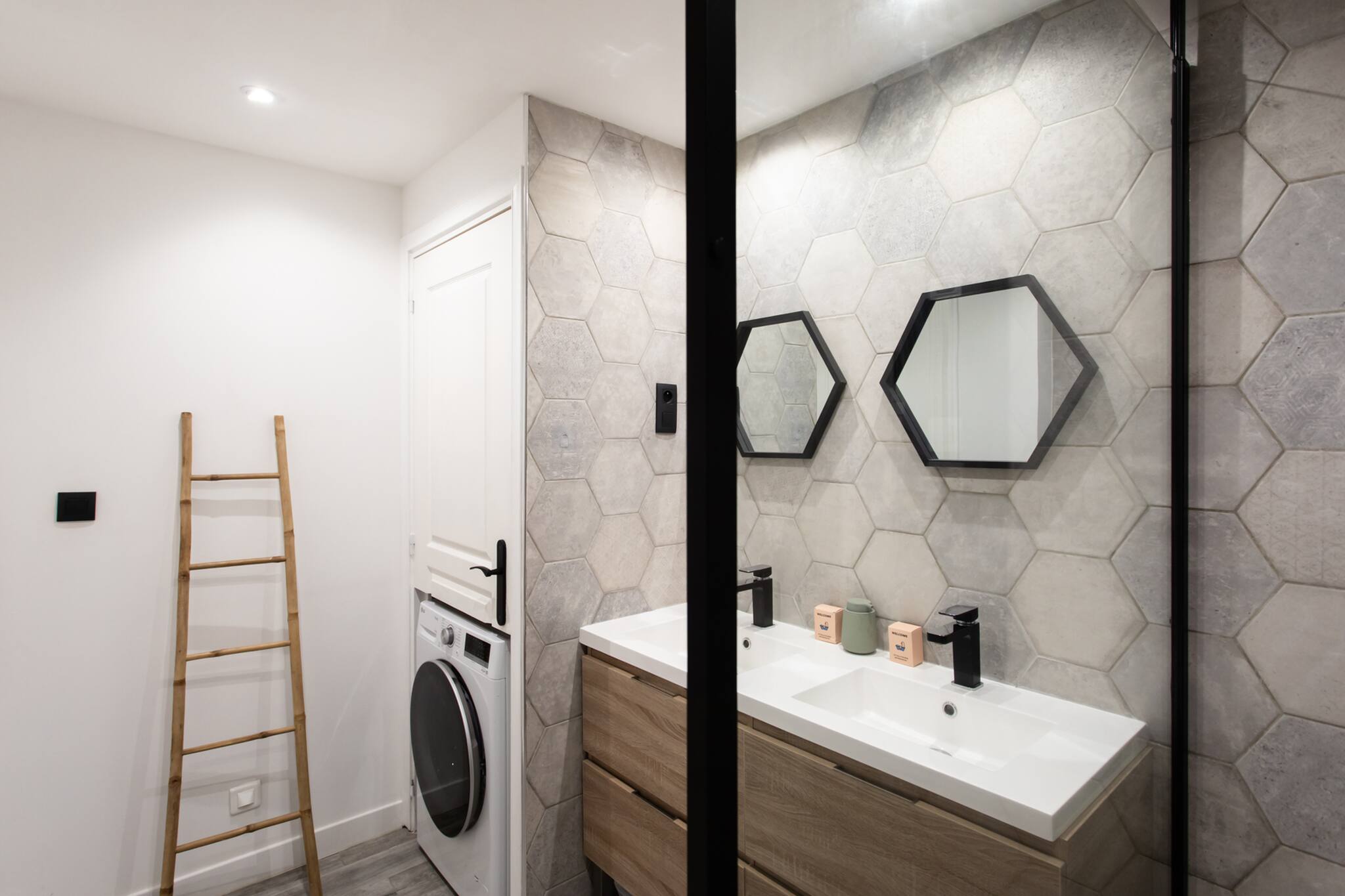 . A shower room with walk-in shower, double vanity unit, washing machine, hairdryer and mirrors