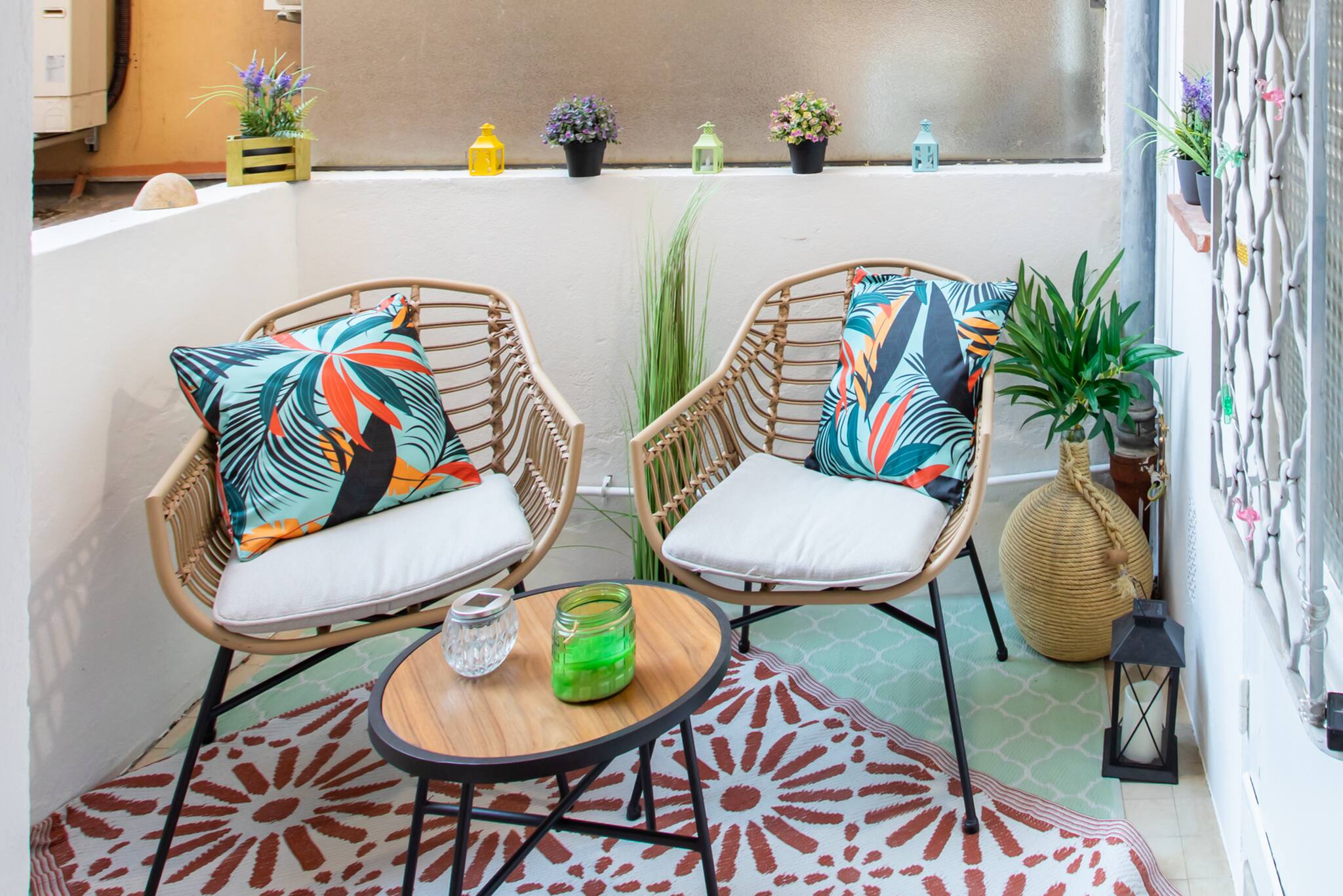 . A balcony with a dining area for two and a relaxation space
