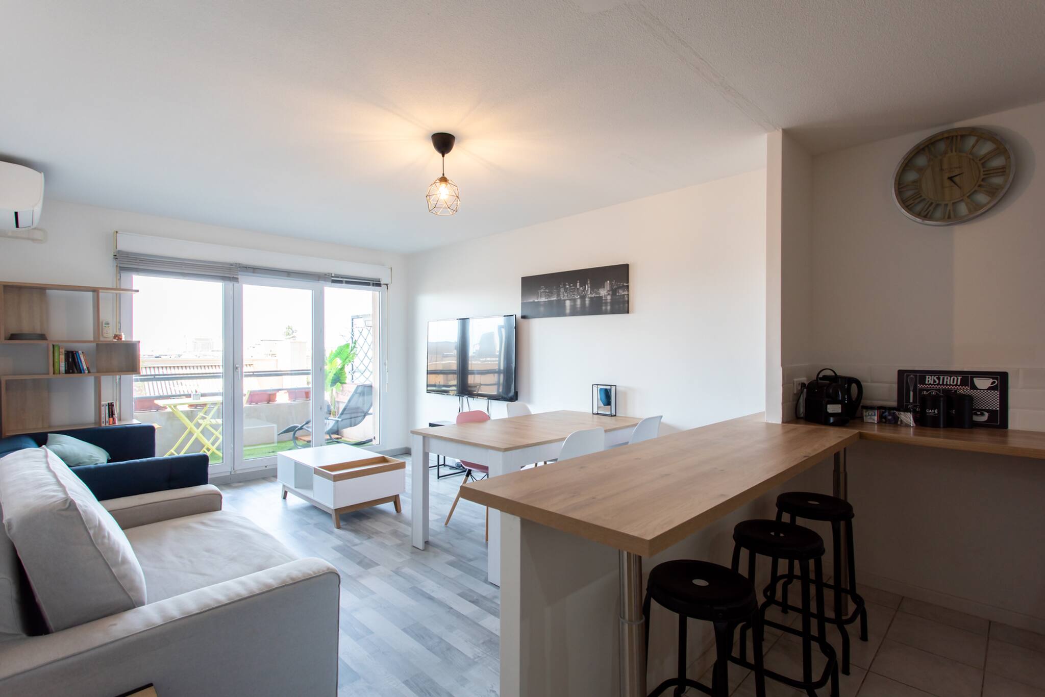 This bright 86m² 5-room flat is located on the 8th floor with lift. With 4 double bedrooms ideal for 8 people. It has all amenities for your stay: a balcony with city view, wifi air conditioning in the living room, wifi, 2 bathrooms, dishwasher, washing machine, dryer, etc. You are 15mins walk from the beach 10mins from the train station and 8 mins from the tram connecting the port to the airport. This accommodation will be ideal for enjoying the French Riviera as a team or family.