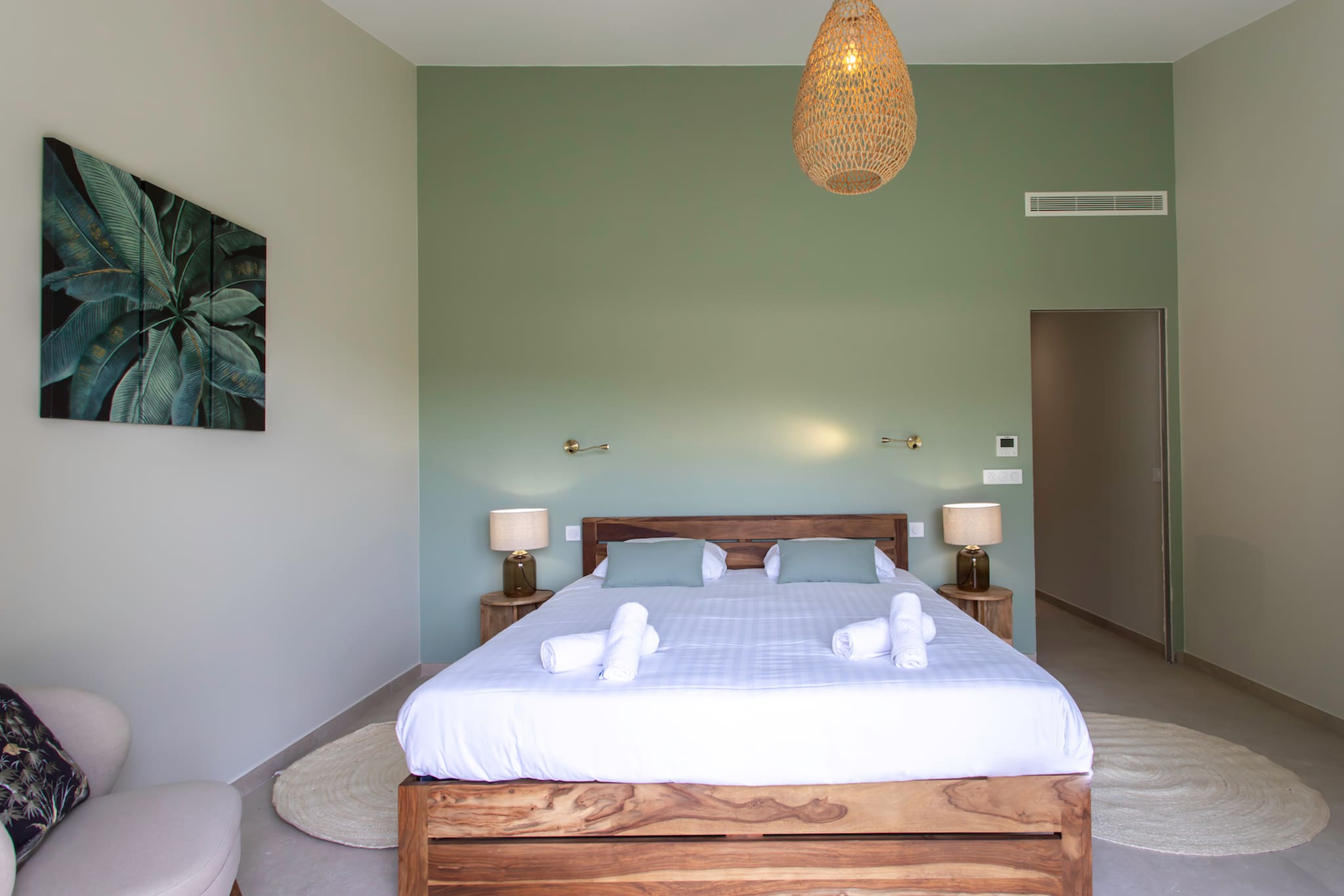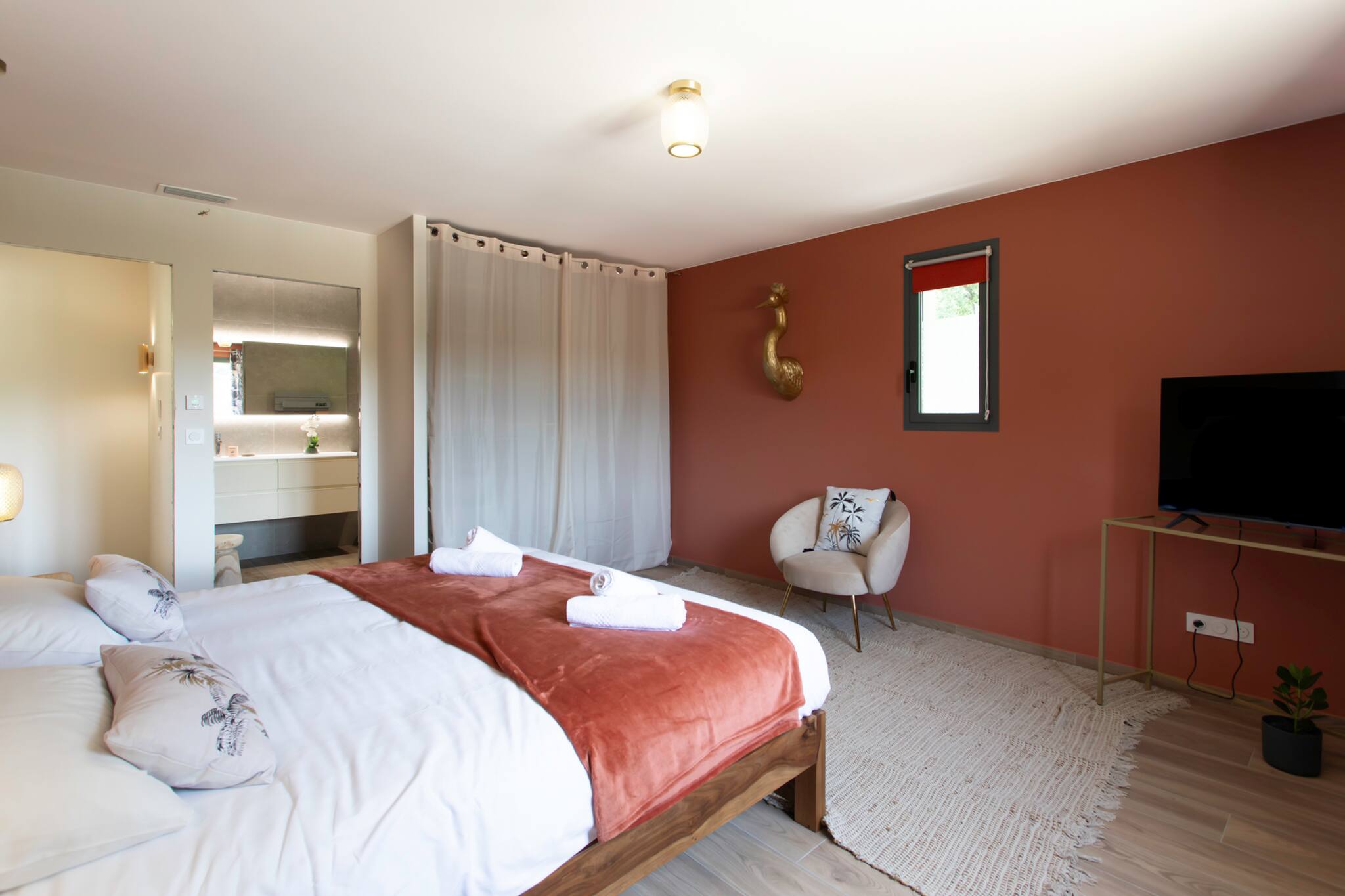 . A second air-conditioned master suite composed of a 160cm double bed, lamps and bedside tables, a TV and a TV unit, a large dressing room and a double-glazed window with a view of the driveway and the garden