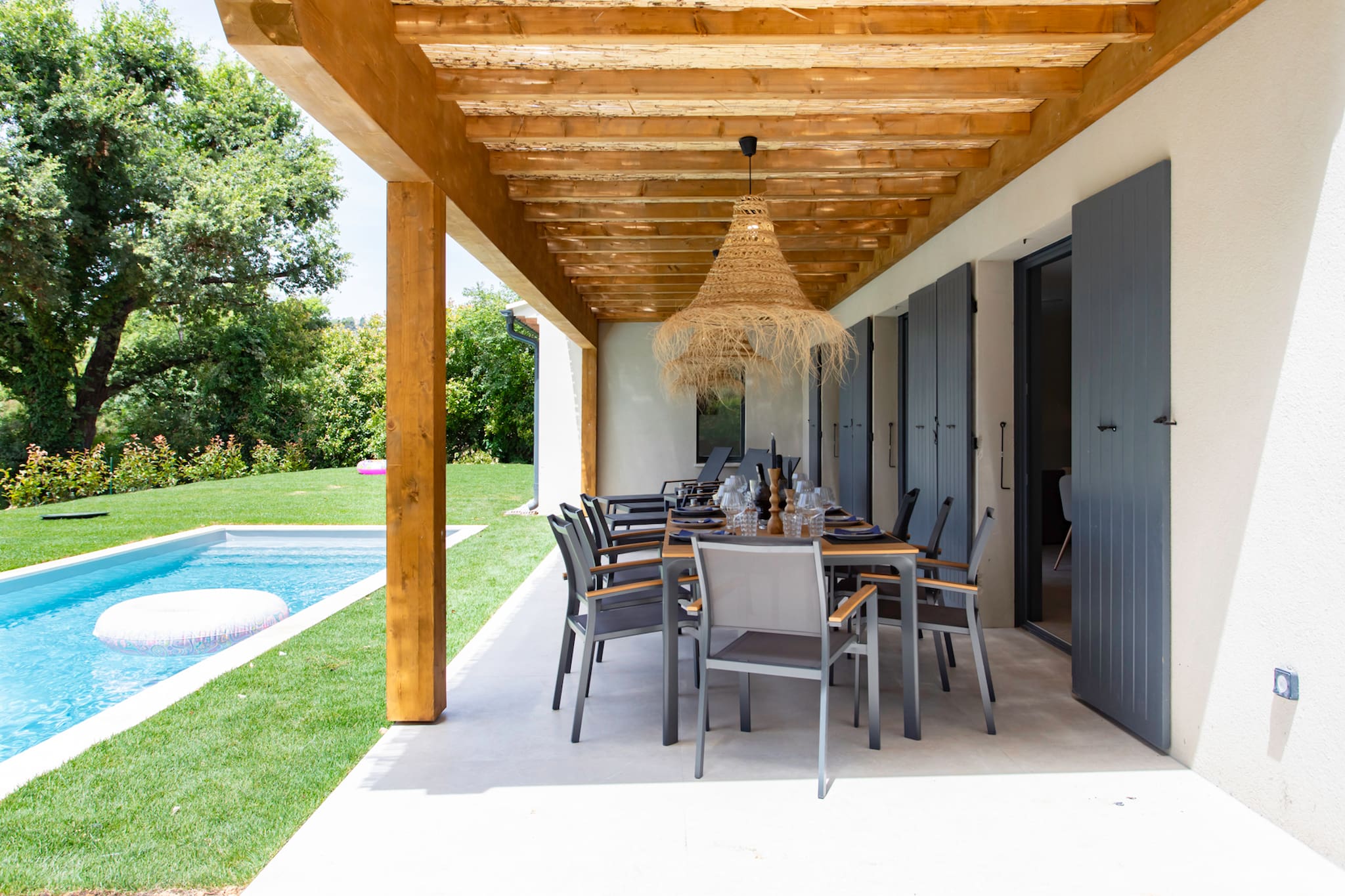 . A main shaded terrace with canopy, equipped with a dining area for 8 people, exterior lights and pool view