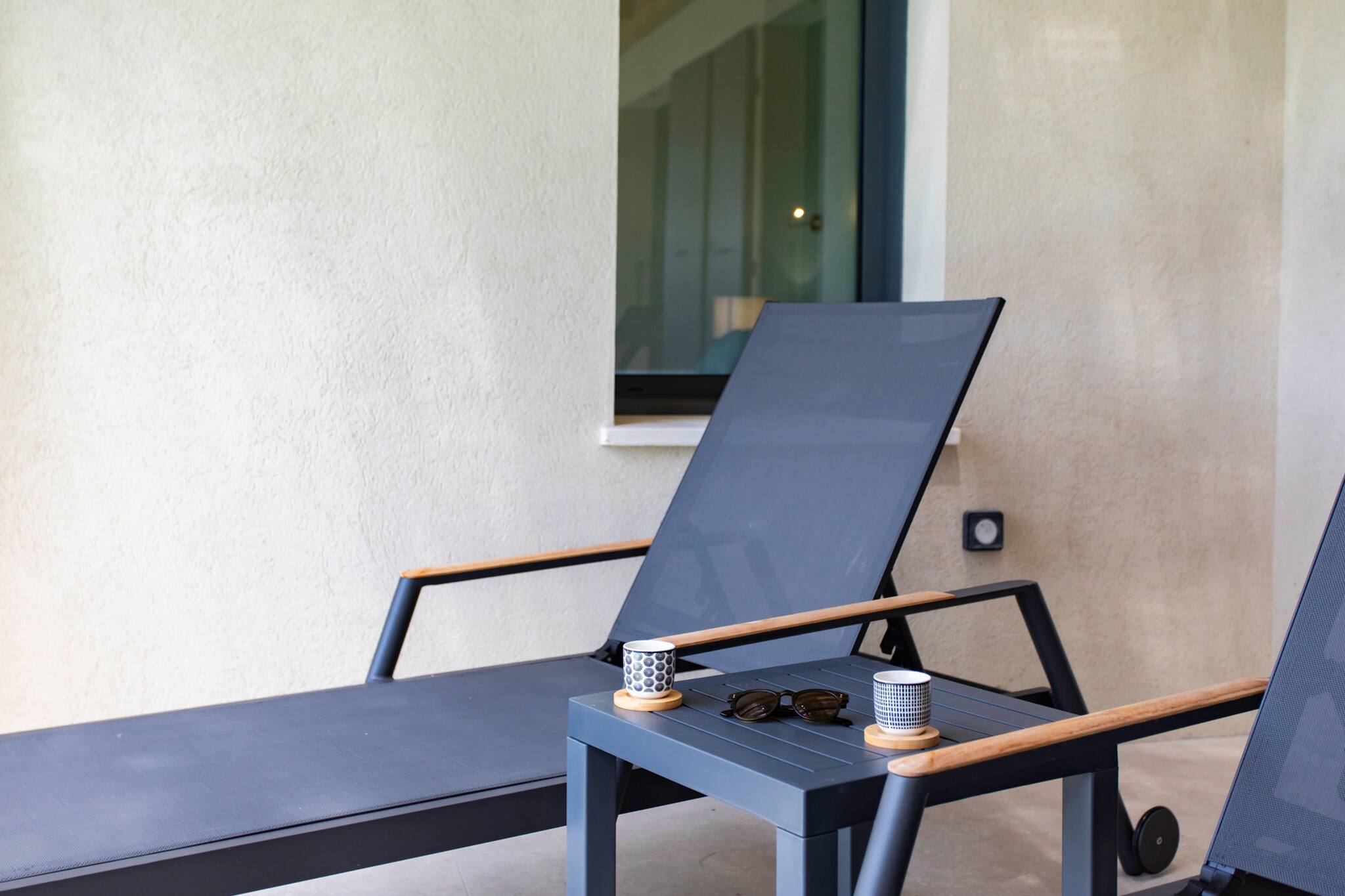 . The pool area is equipped with parasols and four deckchairs with their side tables.