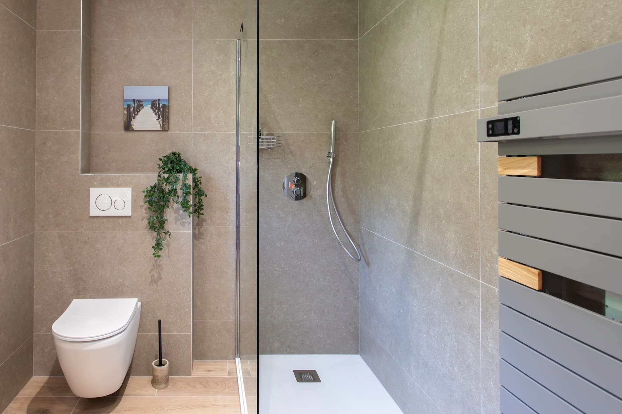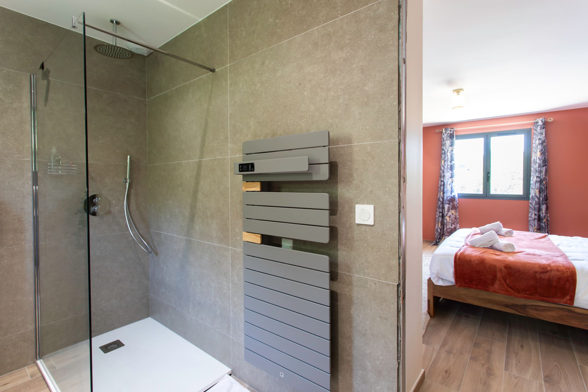 . A bathroom shared by both bedrooms with walk-in shower, mirror, double sink, hairdryer and towel dryer
