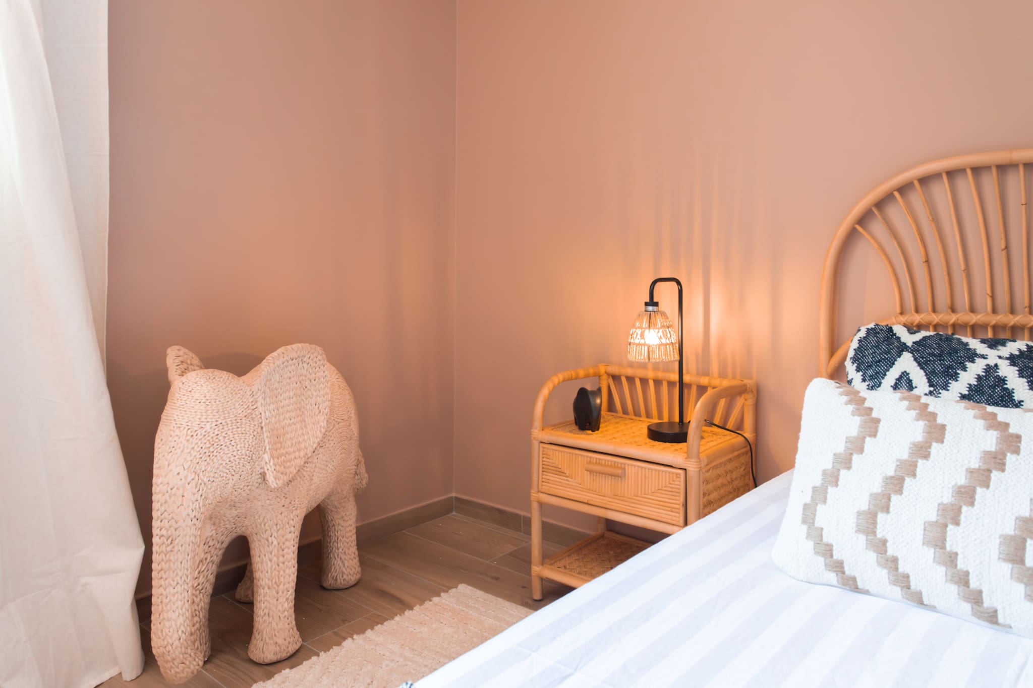 . A second bedroom (the beige bedroom) equipped with two 90cm twin beds, reversible air conditioning, dressing room, bedside tables and bedside lamps, double-glazed window overlooking the garden & swimming pool