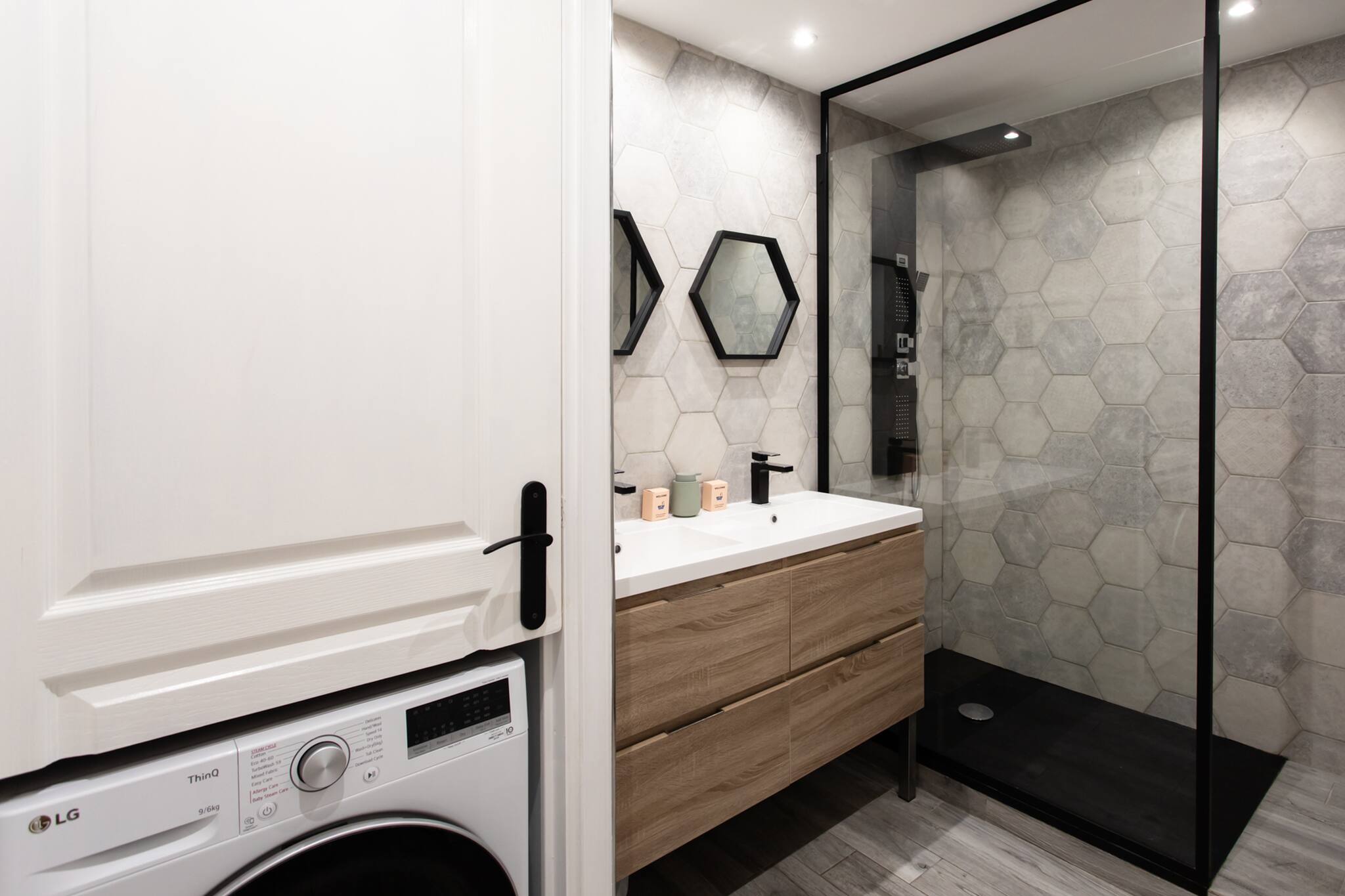 Ha lavatrice, asciugatrice, ferro da stiro, asciugacapelli, riscaldamento centralizzato, aria condizionata, garage in vicino alla struttura, 1 Televisore.