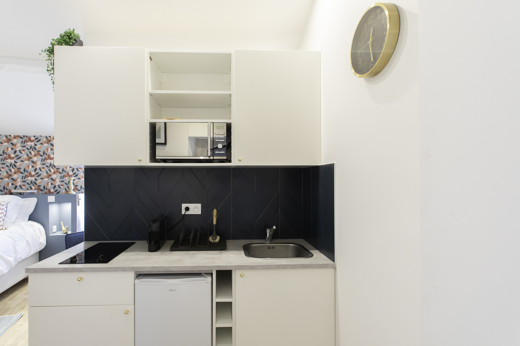 La cucina americana, a induzione, è attrezzata con frigorifero, microonde, forno, congelatore, lavastoviglie, stoviglie/posate, utensili da cucina, caffettiera, tostapane e bollitore.