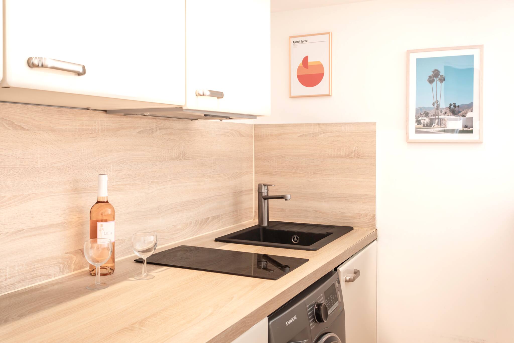 . Une cuisine ouverte entièrement équipée : Frigo ; congélateur, cafetière Nespresso, bouilloire électrique, grille-pain, évier, plan de travail un kit pour cuisiner, vaisselle, couverts et espaces de rangements