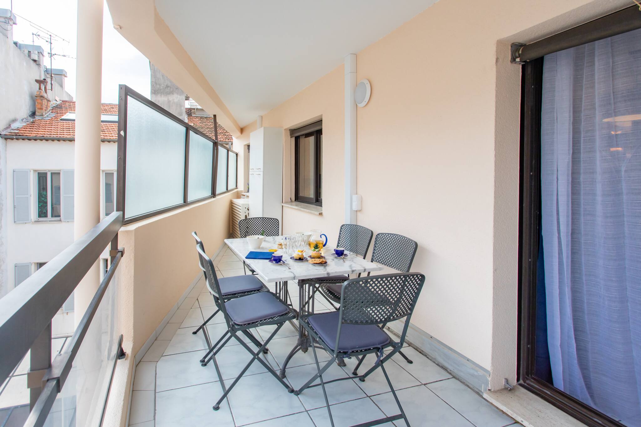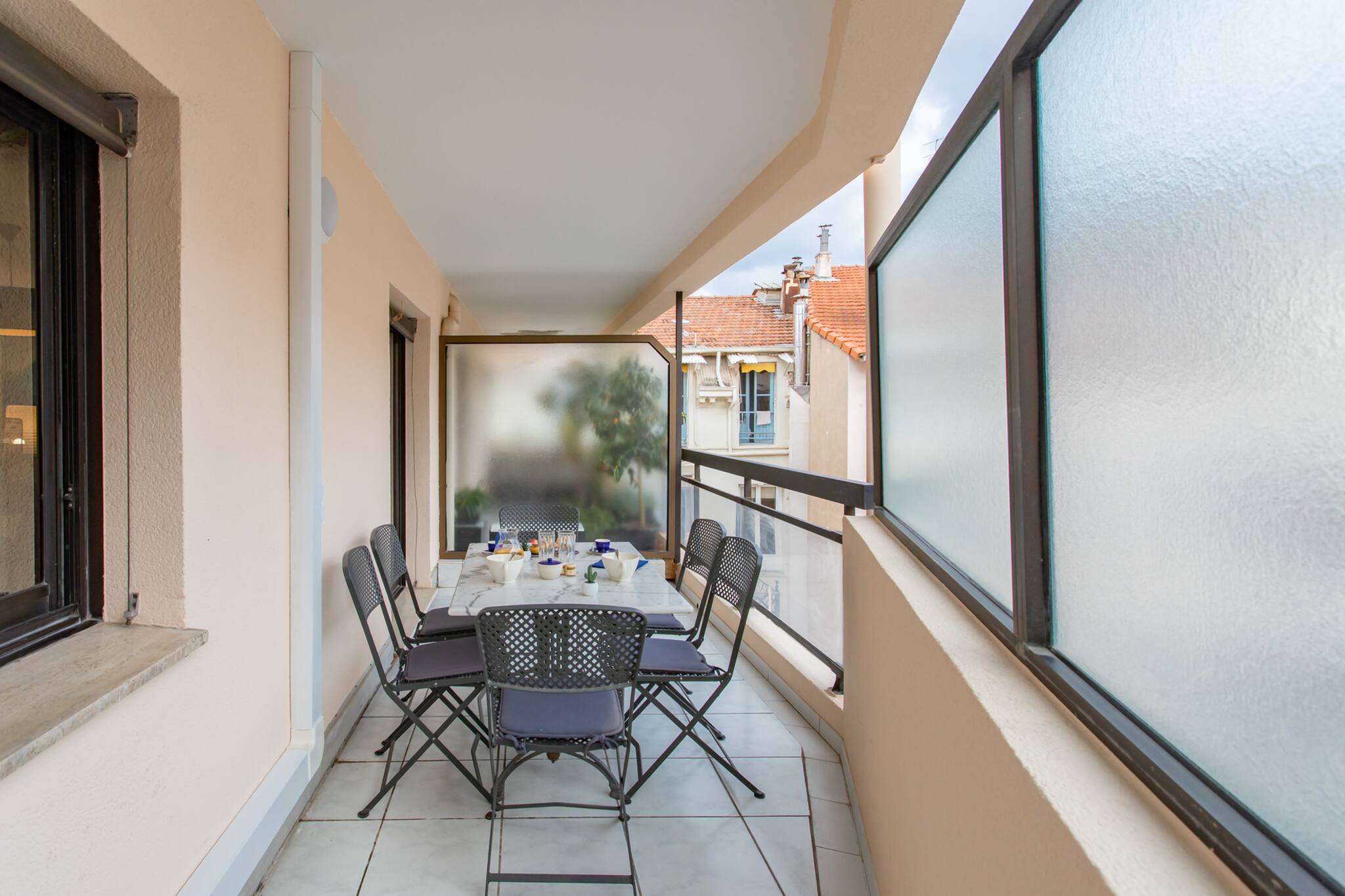 . Un balcon filant donnant sur le boulevard Carnot, équipé d’un espace repas pour quatre, un salon de jardin, des chiliennes, bénéficie d’une vue ville à 180° et aperçue Mer Baie de Cannes