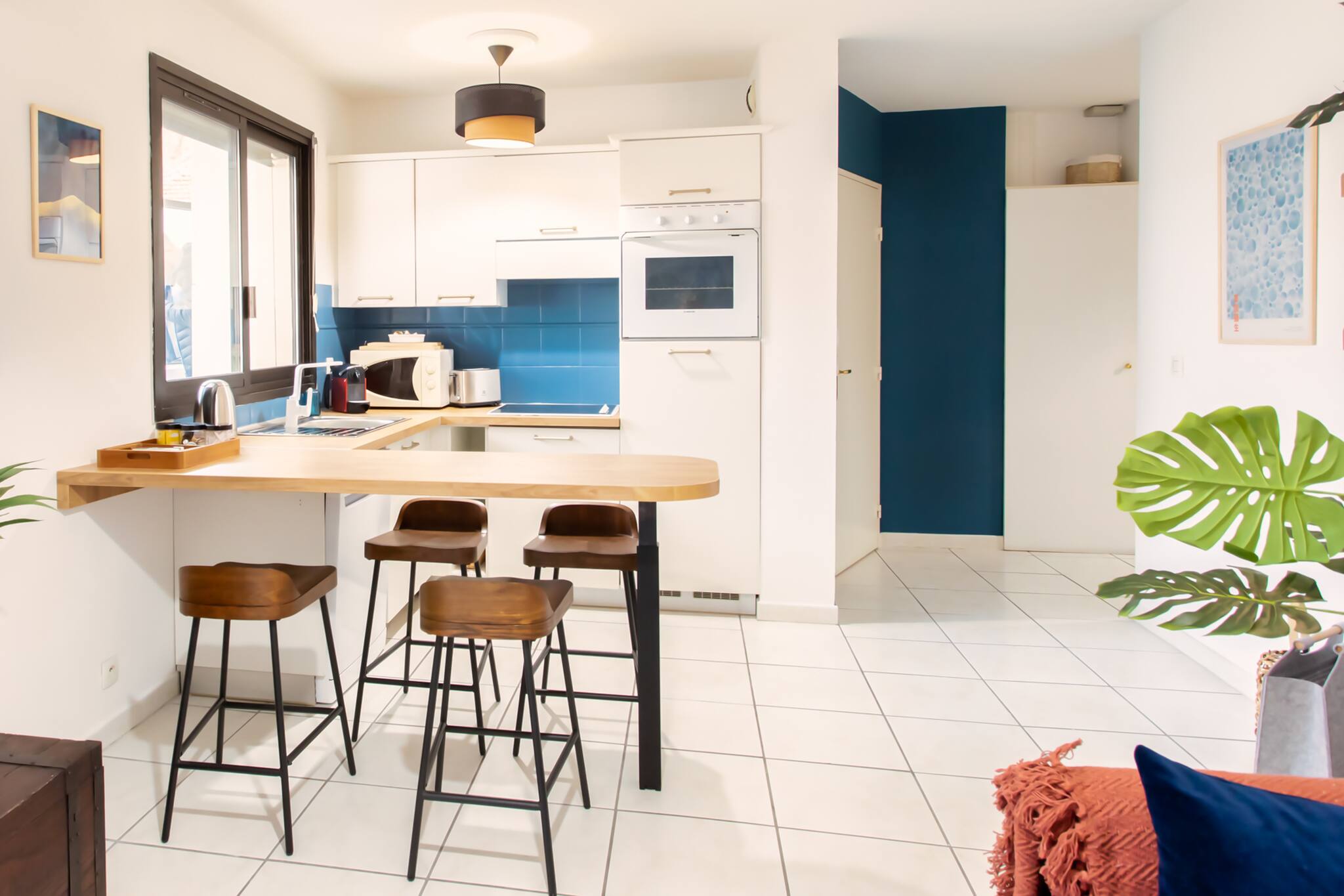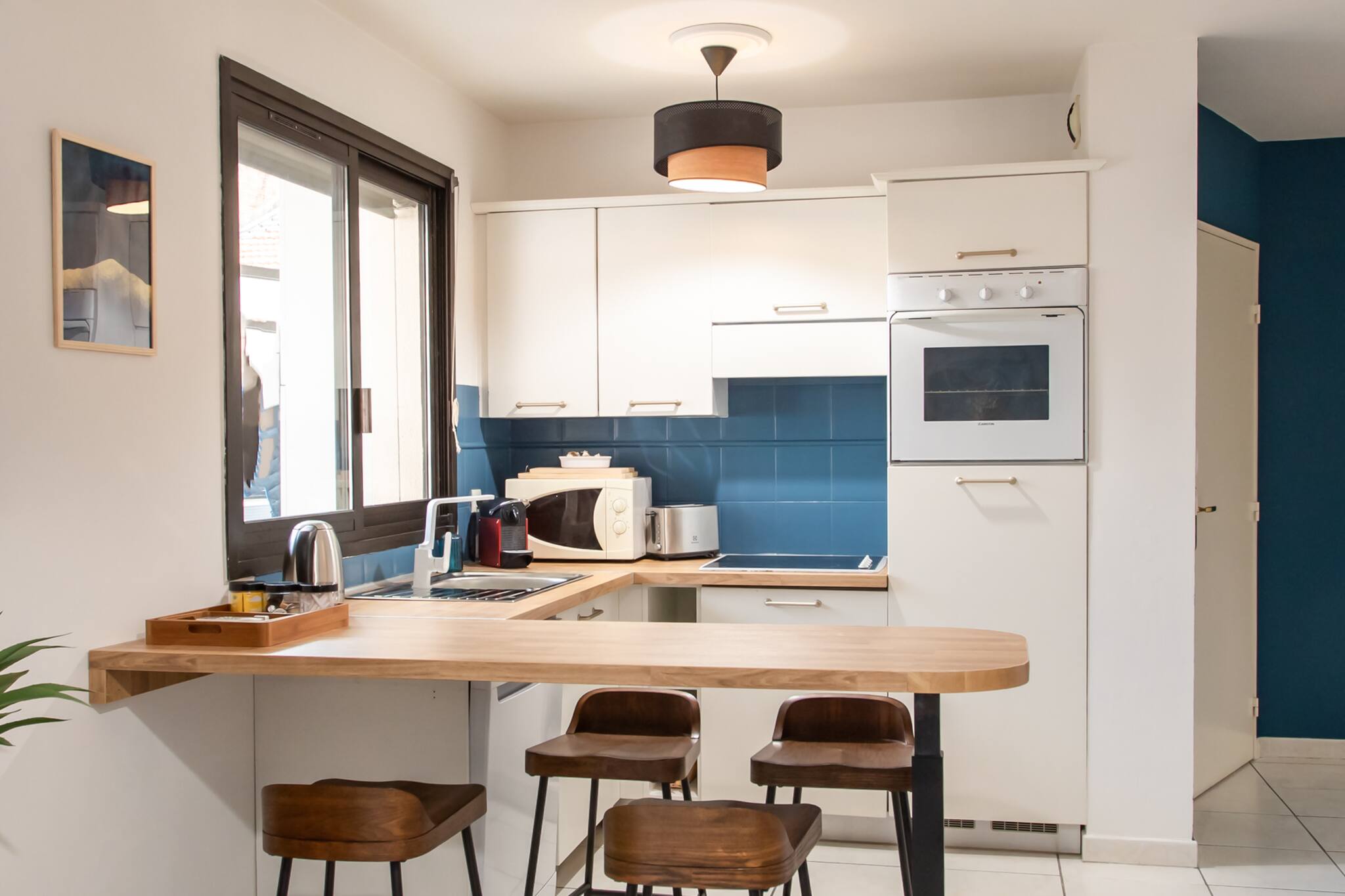 . Une cuisine entièrement équipée : Frigo et congélateur ; four, Cafetière Nespresso, bouilloire électrique, grille-pain, évier, plan de travail, un kit pour cuisiner, vaisselle, couverts et espaces de rangements, mange debout pour quatre personnes avec tabourets
